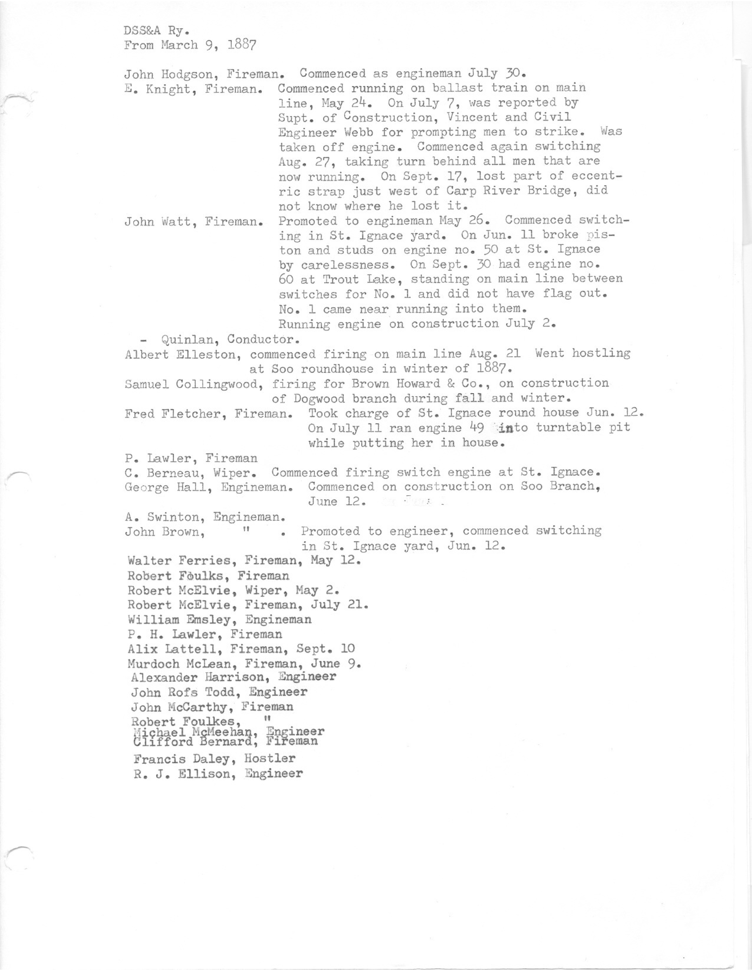 John Hodgson, Fireman. Commenced as engineman July 30. E. Knight, Firemen. Commenced running on ballast train on main line May 24. On July 7, was reported by Supt. Of Construction, Vincent and Civil Engineer Webb for promoting men to Strike.