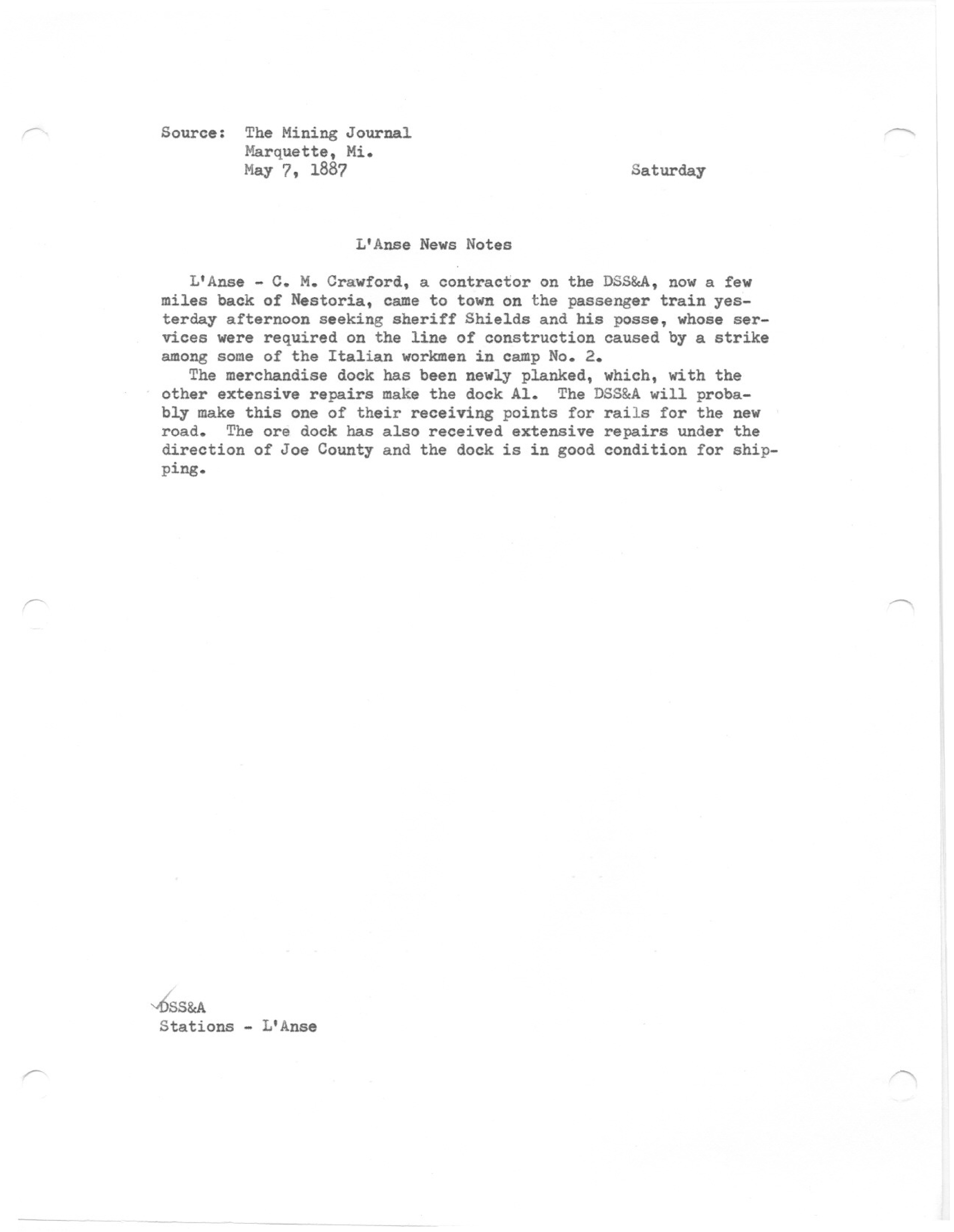 L'Anse - C.M. Crawford a contractor on the DSS&A, now a few miles back of Nestoria, came to town on the passenger train yesterday afternoon seeking sheriff Shields and his posse, whose services were required on the line of construction caused by a strike among some of the Italian workmen in camp No. 2.
