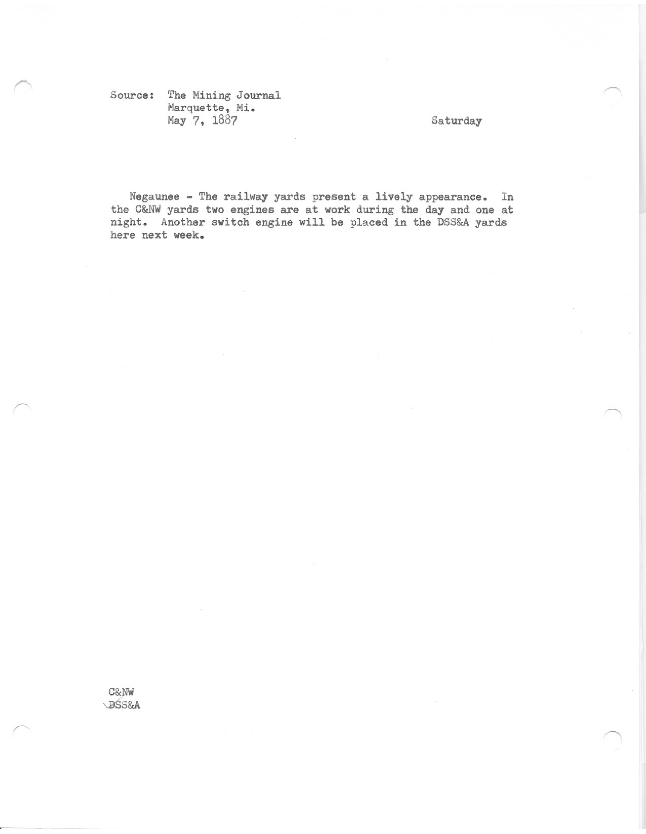 Negaunee - The railway yards present a lively appearance. In the C&NW yards two engines are at work durning the day and one at night. Another switch engine will be placed in the DSS&A yards here next week.