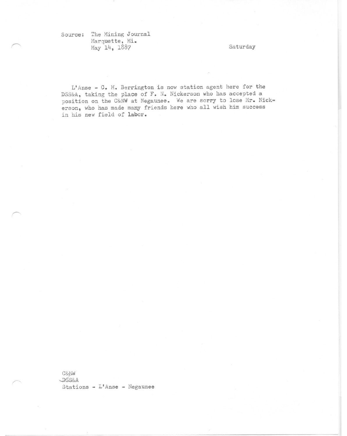 C.M Berrington is now station agent here for the DSS&A taking the place of F.N. Nickerson who has accepted a position on the C&NW at Negaunee. We are sorry to loose Mr. Nickerson, who has made many friends here who will wish him success in his new field of labor.