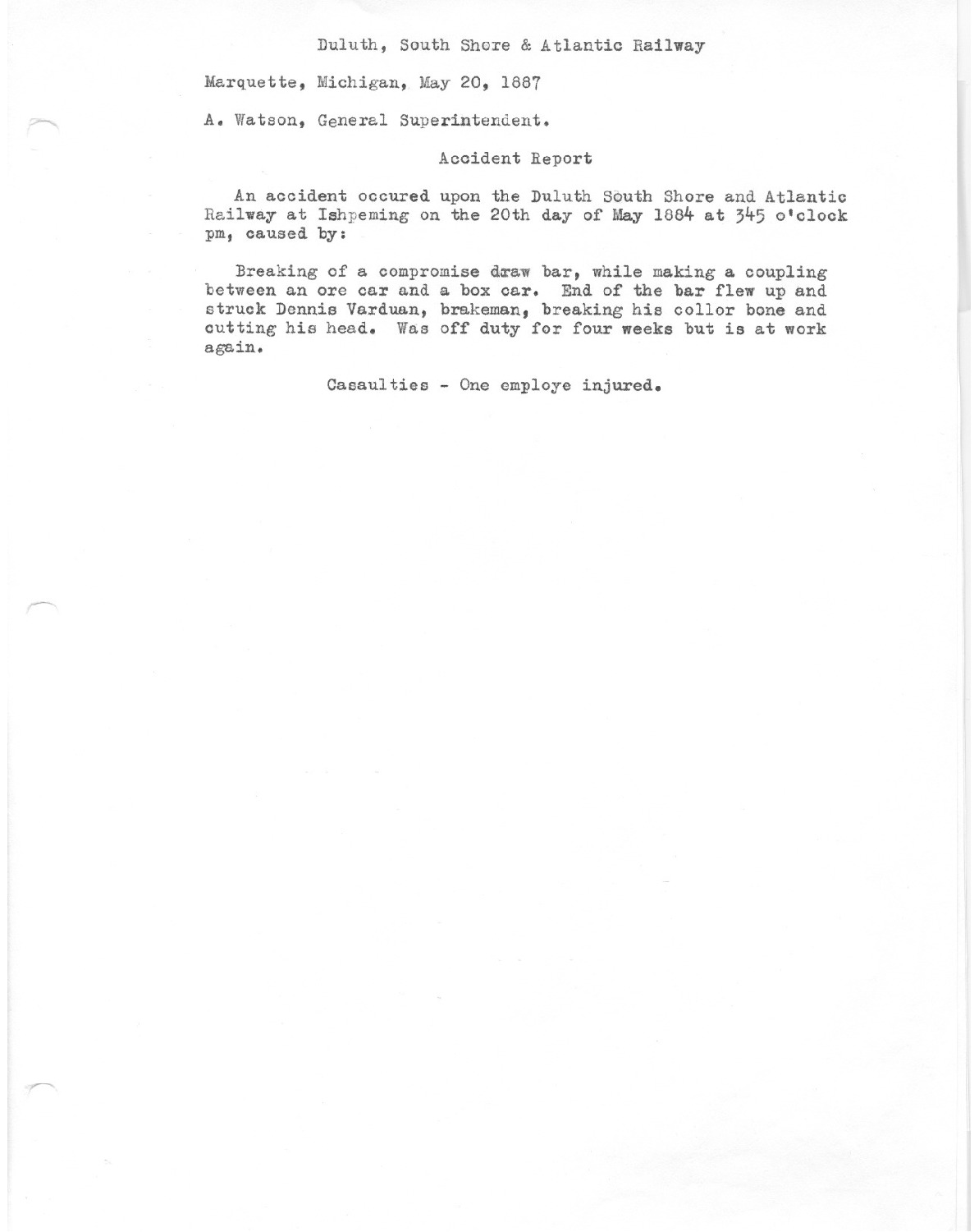 An accident occurred upon the Duluth South Shore and Atlantic Railway at Ishpeming on the 20th day of May 1884 at 345 o'clockpm caused by breaking of a compromse draw bar, while making a coupling between and ore car and a box car. End of the bar flew up and struck dennis Varduan, brakeman, breaking his collor bone and cutting his head. Was off duty for four weeks but is at work again. Casualties - one employe injured.