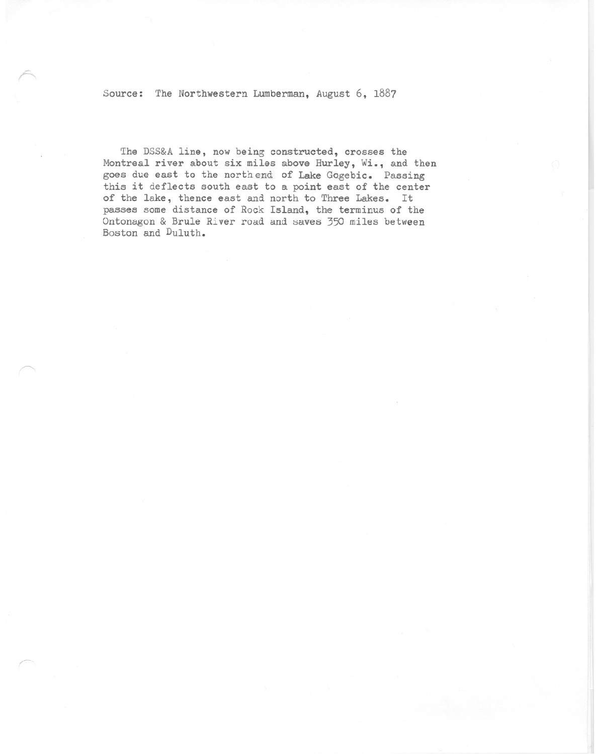 The DSS&A line, now being constructed, crosses the Montreal river about six miles above Hurley, Wisconsin and then goes due east to the north end of Lake Gogebic. Passing this it deflects south east to a point east of the center of the lake, thence east and north to Three Lakes. It passes some distance of Rock Island, the terminus of the Ontonagon & Brule River road and saves 350 miles between Boston and Duluth.