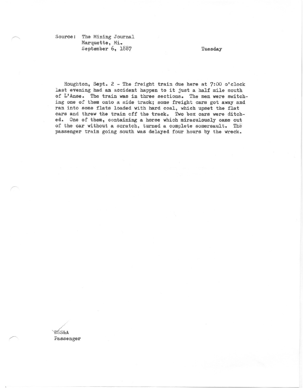 The freight train due here at 7:00 o'clock last evening had an accident happen to it just a half a mile south of L'Anse. The train was in 3 sections. The men were switching one of them onto a side track; some freight cars got away and ran into some flats loaded with hard coal, which upset the flat cars and threw the train off the track. Two box cars were ditched. One of them, containing a horse which miraculously came out of the car without a stratch, turned a complete somersault. The passenger train going south was delayed four hours by the wreck.