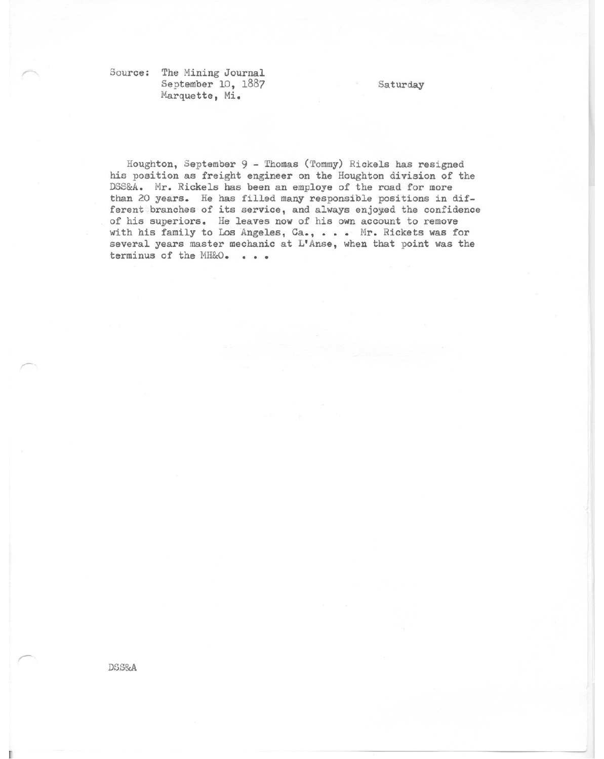 Rickels has resigned his position as freight engineer on the Houghton divison of the DSS&A. Mr. Rickels has been an employee of the orad for more than 20 years. He has filled many responsible positions in different branches of the its service, and always enjoyed the confidence of his superiors. He leaves now of his own account to remove with his family to Los Angeles California, Mr. Rickets was for several years master mechanic at L'Anse when that point was the terminus of the MH&O.