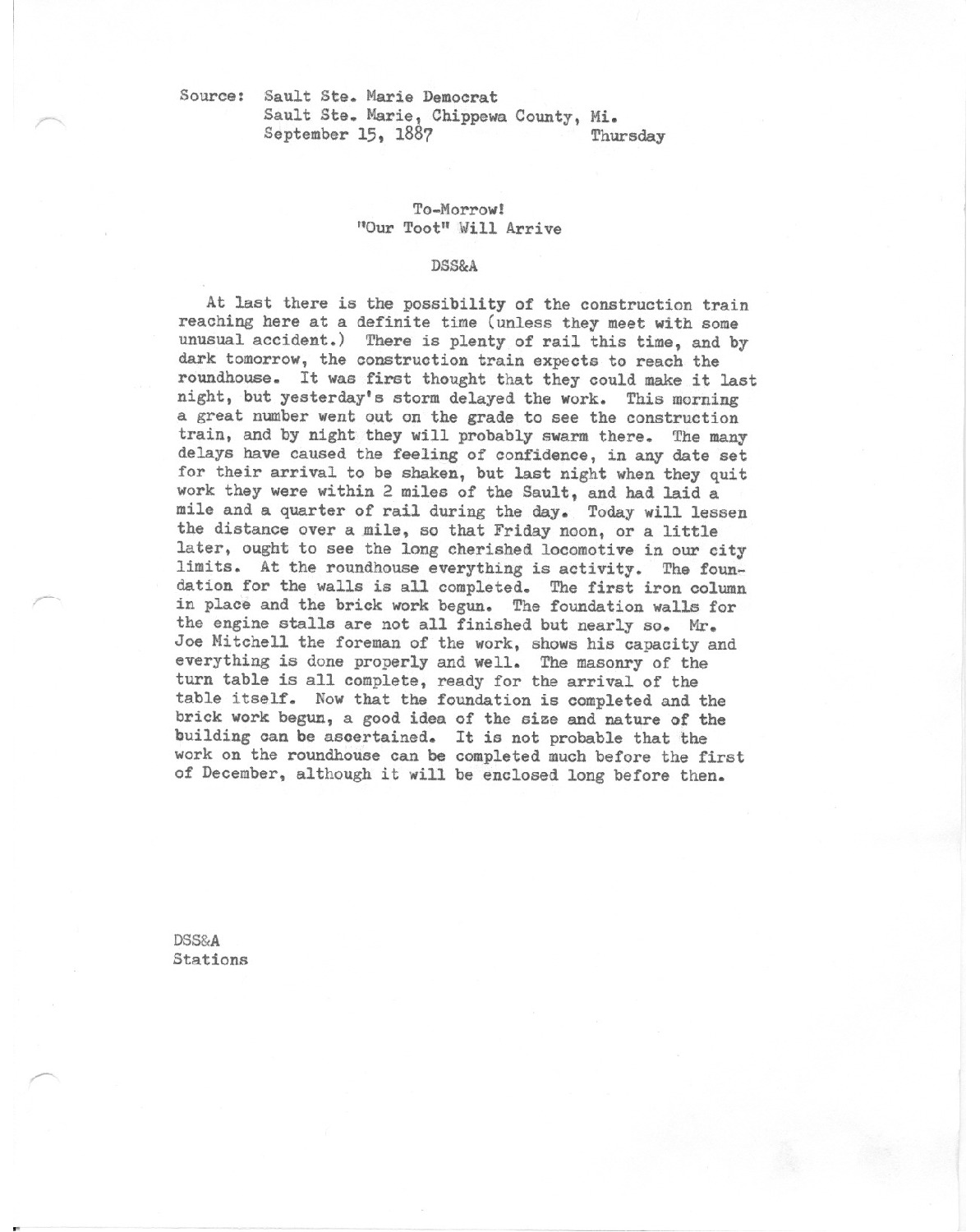 At last there is the possibility of the construction train reaching here at a definite time (unless they m eet with some unusal accident.) There is plently of rail this time, and by dark tomorrow, the construction train expects to reach the roundhouse. It was first thought that they could make it last night, but yesterday's storm delayed the work.
