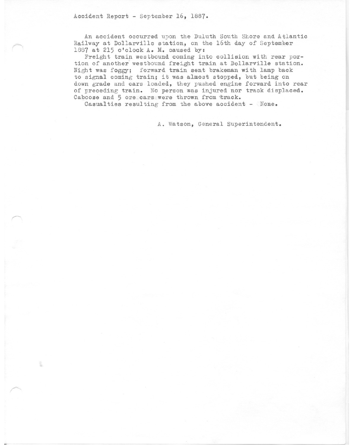 An accident occurred upon the Duluth South Shore and Atlantic Railway at Dollarville station, on the 16th day of September 1887 at 215 o'clcock A.M. caused by: Freight train westbound coming into collision with rear portion of another westbound freight train at Dollarville station. Night was foggy; forward train sent brakeman with lamp back to signal coming train; it was almost stopped, but being no down grade and cards loaded, they pushed engine forward into rear of proceding train. No person was injured nor track displaced. Caboose and 5 ore cars were thrown from track. Casualties resulting from the above accident - None.