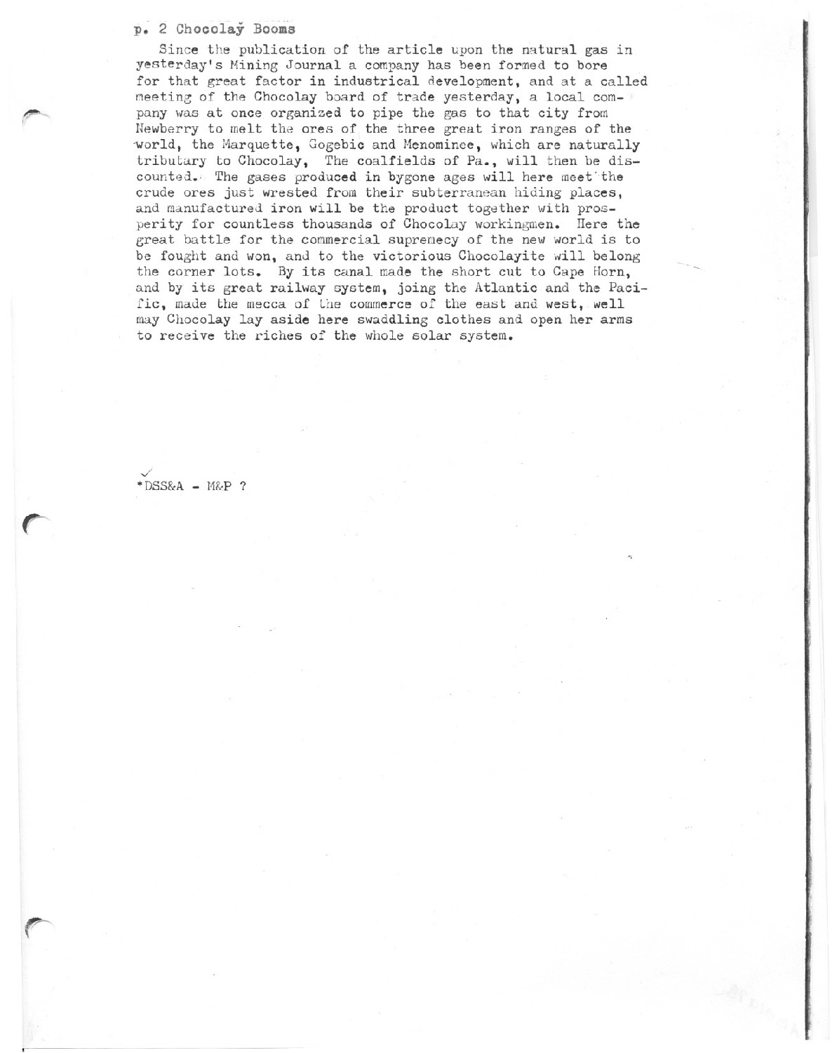 Chocolay booms : preparing to annex the Sault, Gladstone, the Universe and Part of Texas (2 pages)