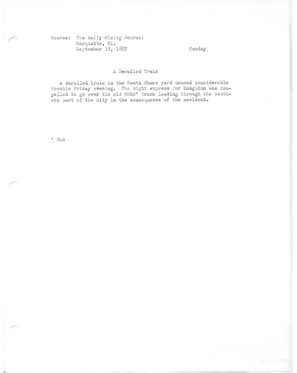 A derailed train in the South Shore yard caused considreable trouble Friday evening. The night express for Houghton was compelled to go over the old MH&O track leading through the southern part of the city in the consequence of the accident.