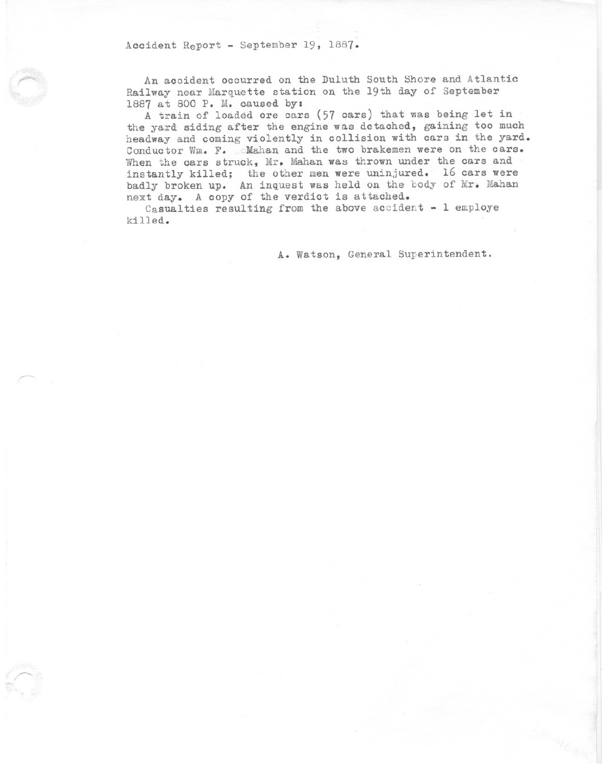 An accident occurred upon the Duluth South Shore and Atlantic Railway near the Marquette station on the 19th day of September 1887 at 800 P.M. caused by: A train of loaded ore cars (57) that was being let in the yard siding after the engine was detached,m gaining to much headway and coming violently in collision with cards in the yard. Conductor William F. Mahan and the two breakemen were on the cards. When the cards struck, Mr. Mahan was thrown under the cards and instantly killed; the other men were uninjured. 16 cards were badly broken up. An inquest was held on the body of Mr. Mahan next day. A copy of the verdict is attached. Casualties resulting from the above accident 1 employee killed.