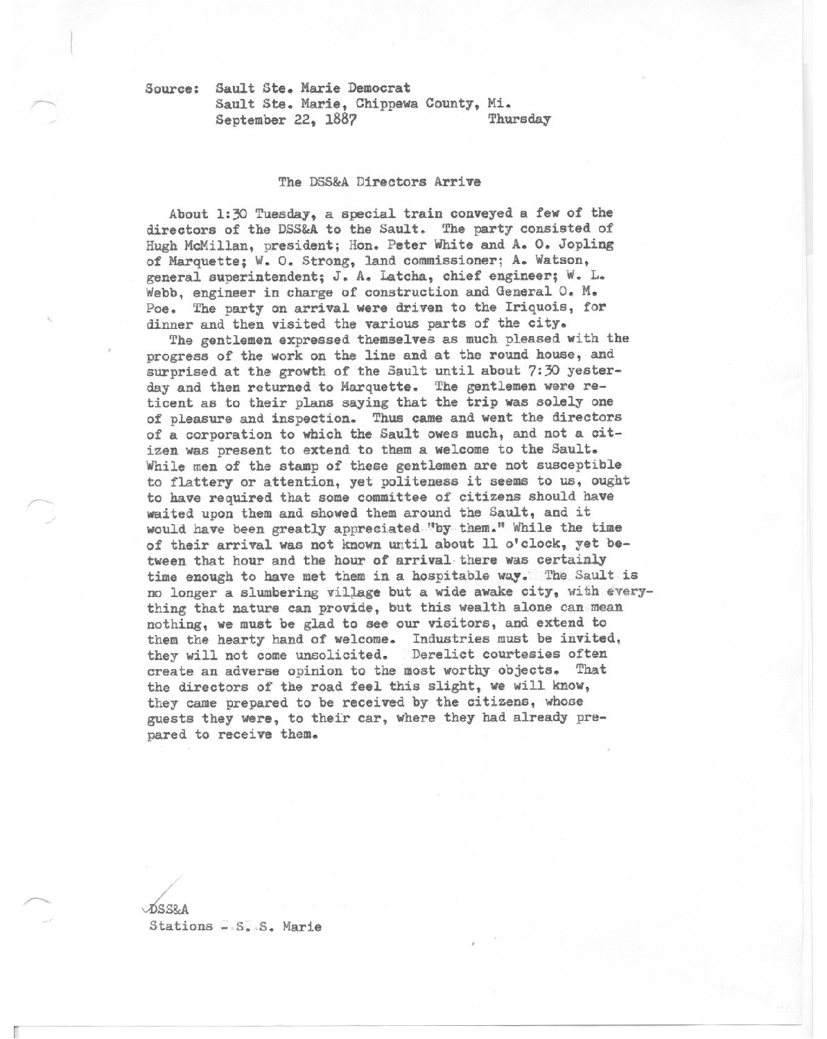 About 1:30 Tuesday, a special train conveyed a few of the directors of the DSS&A to the Sault. The party consisted of High McMillan, President; Honorable Peter White and A. O. Jopling of Marquette; W. O. Strong land commissioner; A. Watson General Superintendent; J. A. Latcha, cheif engineer; W. L. Webb, engineer in charge of construction and General O. M. Poe. The party on arrival were driven to the Iriquois, for dinner and then visited the various parts of the city.