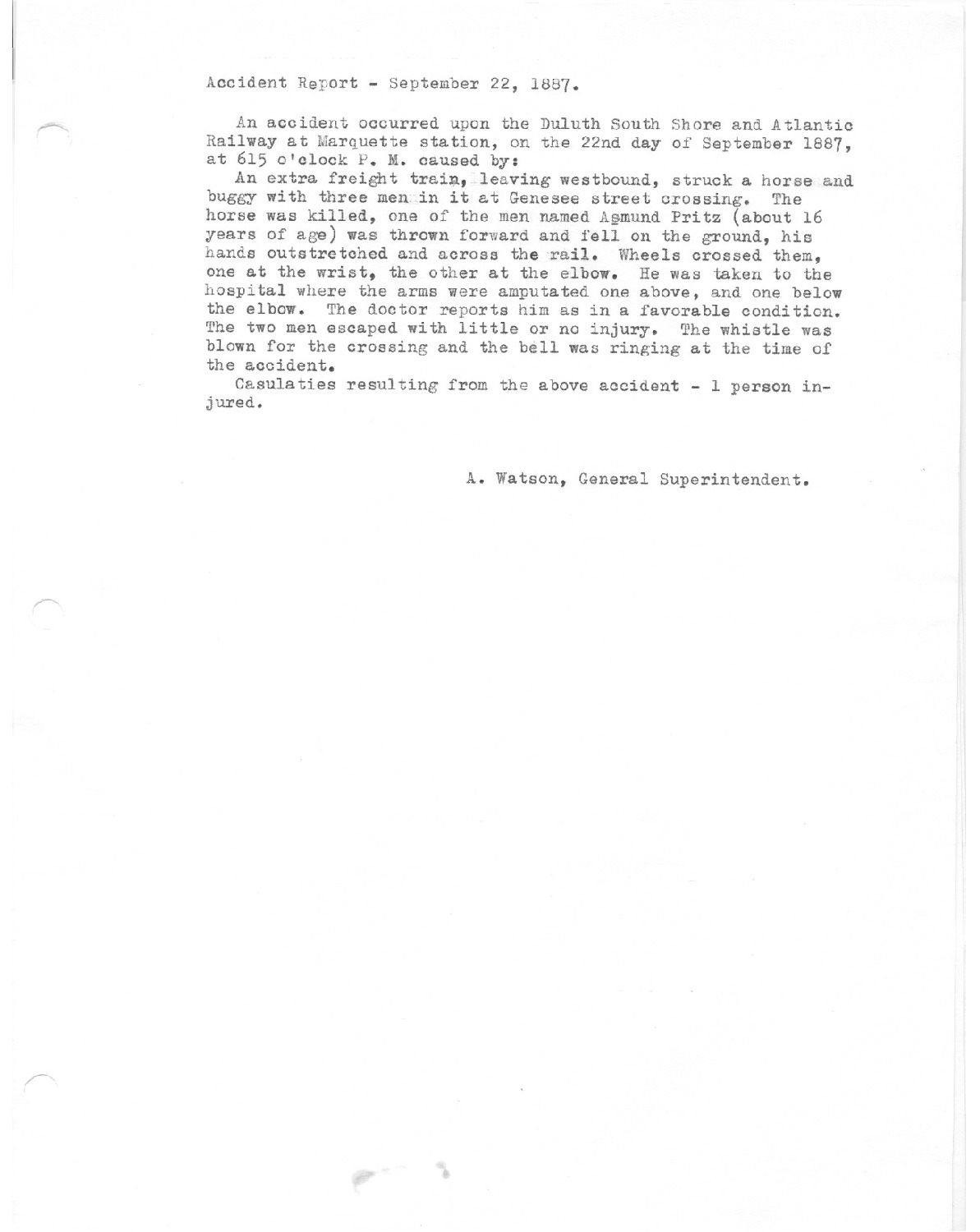 An accident occuured upon the Duluth South Shore and Atlantic Railway at Marquette station, on the 22nd day of September 1887, at 615 o'clock P.M. caused by: An extra freight train, leaving westbound, struck a horse and buggy with 3 men in it as Genesse street crossing. The horse was killed, one of the men named Asmund Pritz (16 years of age) was thrown forward and fell on the ground, his hands outstretched and across the rail. Wheels crossed them, one at the wrist, other at the albow. He was taken to the hsoptial where the arms were amputed one above, one below the elbow. The doctors reports him as in a favorable condition. The two men escaped with little or no injury. The whistle was blown for the corssing and the bell was ringing at the time of the accident. Casualties resulting from the above accident - 1 person injured.