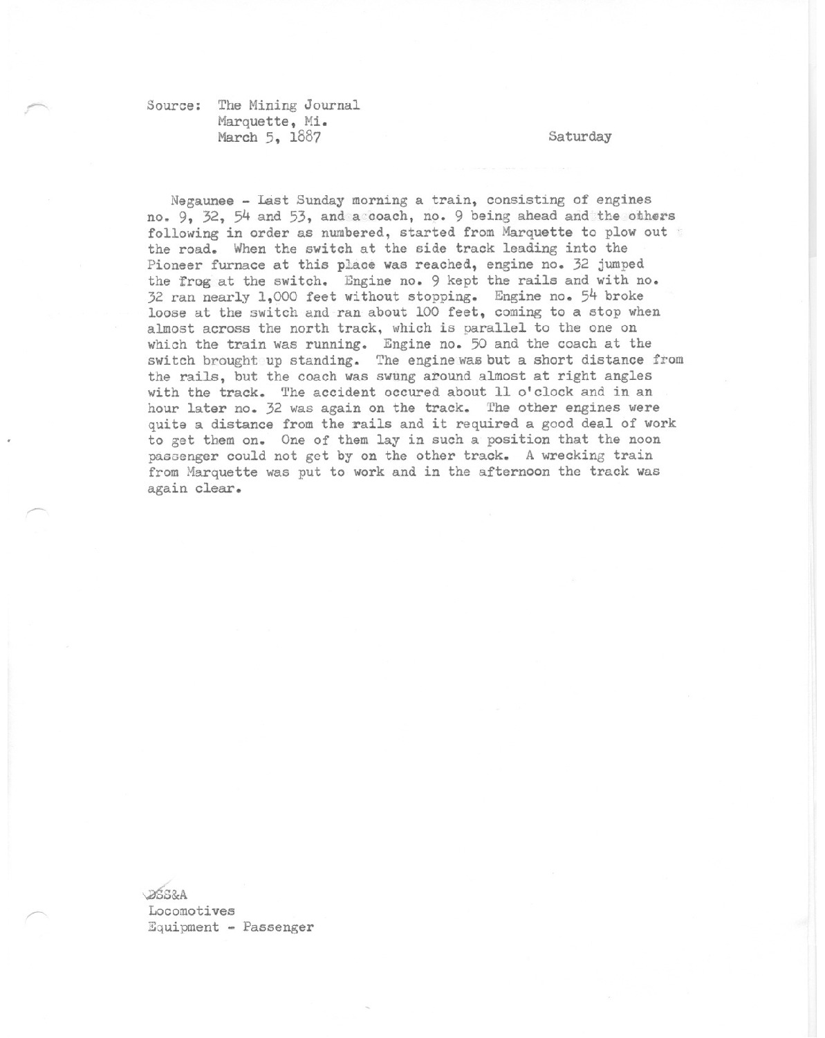 The last Sunday morning a train, consisting of engines no 9, 32, 54 and 53, and a coach no 9 being ahead and the others following in order as numbered, started from Marquette to plow out the orad. When the switch at the side track leading into the Pioneer furnace at this place is reached, engine no 32 jumped the fog at the switch. Engine no 9 kept the rails and with no. 32 ran nearly 1,000 feet without stopping. Engine no. 54 broke loose at the switch and ran about 100 feet, coming to a stop when alsomost acorss the north track, which is parallel to the one on which the train was running.