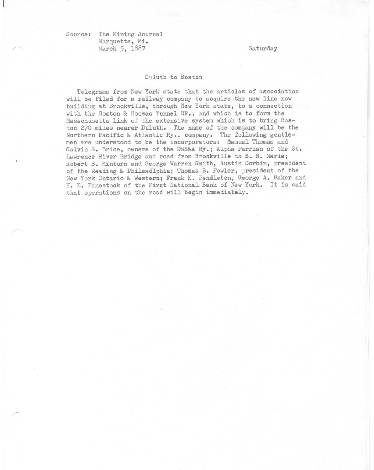Telegrams from New York state that the articles of association will be filed for a railway company to acquire to new line now building at Brockville, through New York State, to a connection with the Boston & HoosacTunnel Railroad, and which is to form the Masschusetts link of the extensive system which is to bring Boston 270 miles nearer to Duluth.
