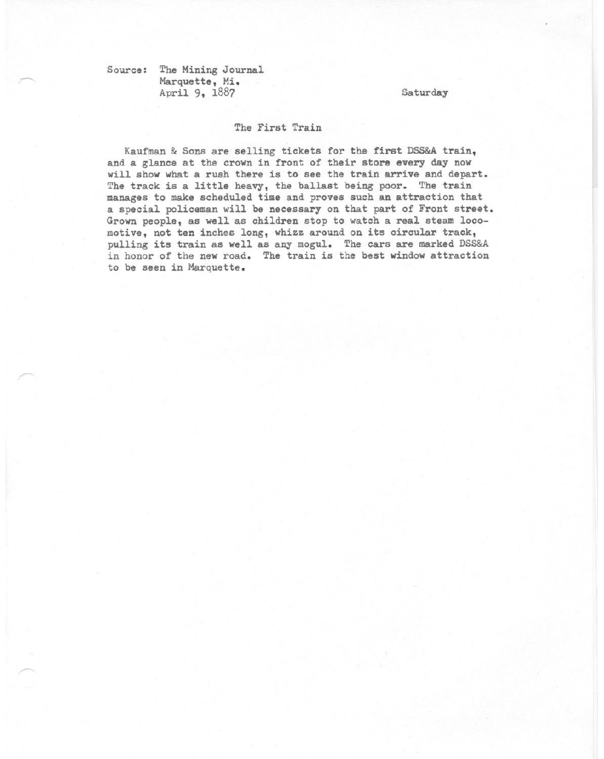 Kuafman & Sons are selling tickets for the first DSS&A train, and a glance at the crown in front of their store every day now will show what a rush there is to see the train arrive and depart. The traick is a little heavy, the bassast being poor. The train manages to make scheduled time and proves such an attraction that a special policman will be necessary on that part of front street. Grown people, as well as children stop to watch a real steam locomotive, not ten inches long, whizz around on its circular track, pulling its train as well as any mogul. The cars are marked DSS&A in honor of the new road. The train is the best window attraction to be seen in Marquette.