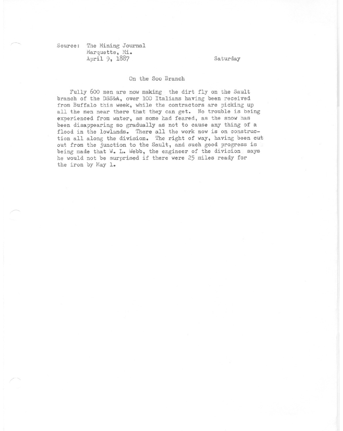 Fully 600 men are now making the dirt fly on the Sault branch of the DSS&A, over 100 Italians have been received from Buffalo this week, while the contractors are picking up all the men neaer there they they can get. No trouble is being experienced from water, as some had feared, as the snow has been disappearing so gradually as not to cause any thing of a flood in the lowlands.