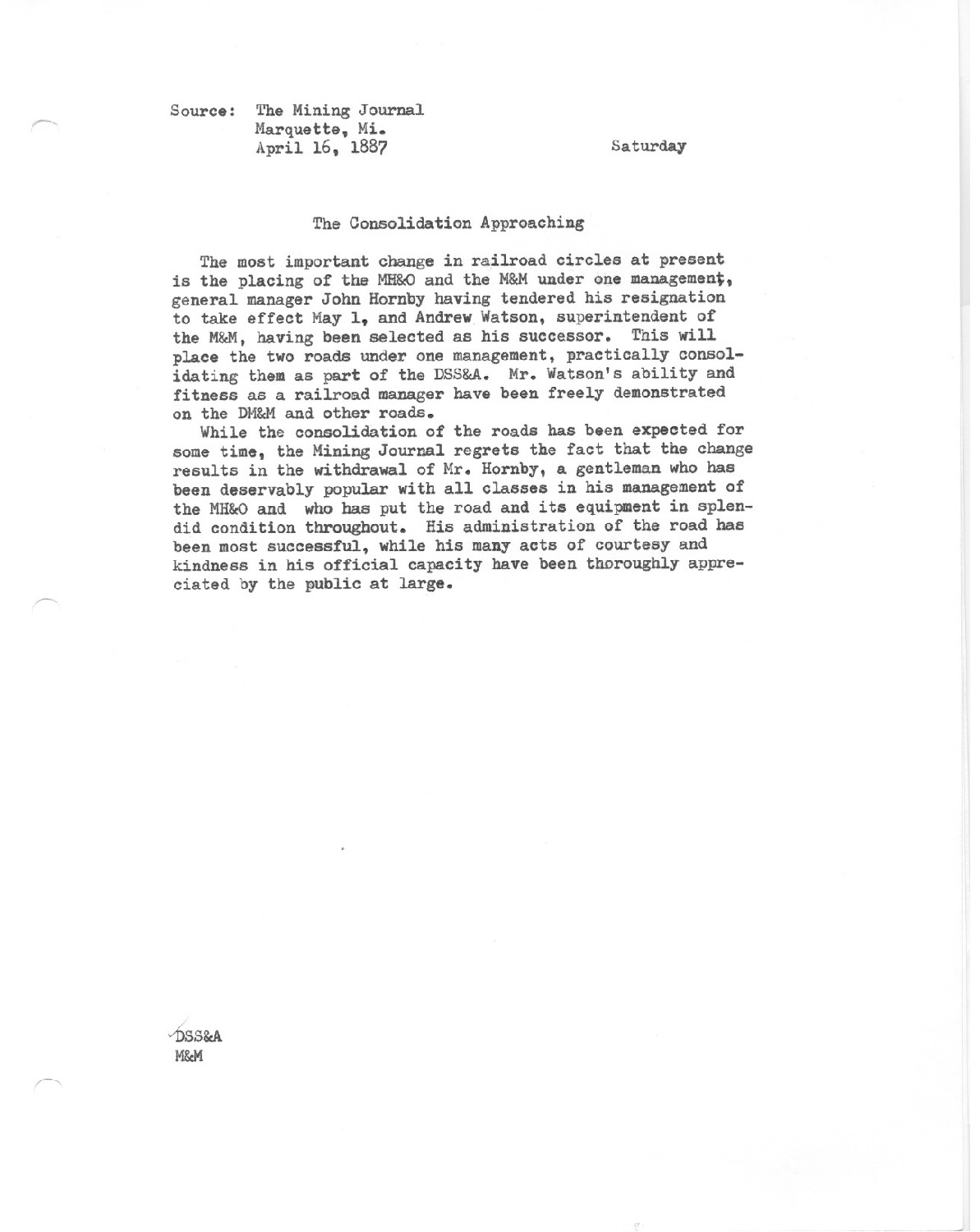 Most important change in railroad circles at presdent is the placing of the MH&O and the M&M under one management, general manager John Hornby having tendered his regisnation to take effect May 1, and Andrew Watson, superindentent of the M&M, having been selected as his successor. This will place the two raods under one manangement, practically consoldating them as part of the DSS&A. Mr. Watson's ability and fitness as a railroad manager have been freely demonstrated on the Dm&M and other roads.
