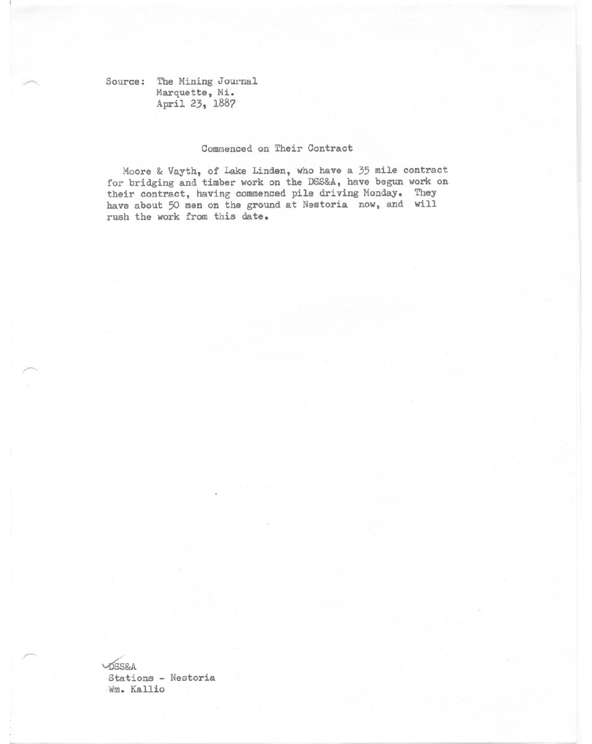 Moore & Vayth of Lake Linden who have a 35 mile contract for bridging and timber work on the DSS&A have begun work on their contract, having commenced pile drive Monday. They have about 50 men on the ground at Nestoria now, and will rush the work from this date.