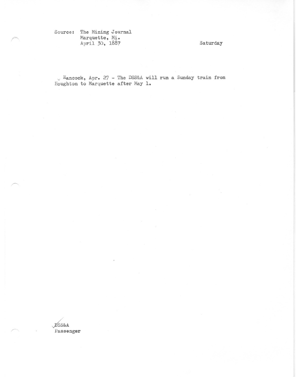 The Duluth South Shore & Atlantic will run a Sunday train from Houghton to Marquette after May 1.