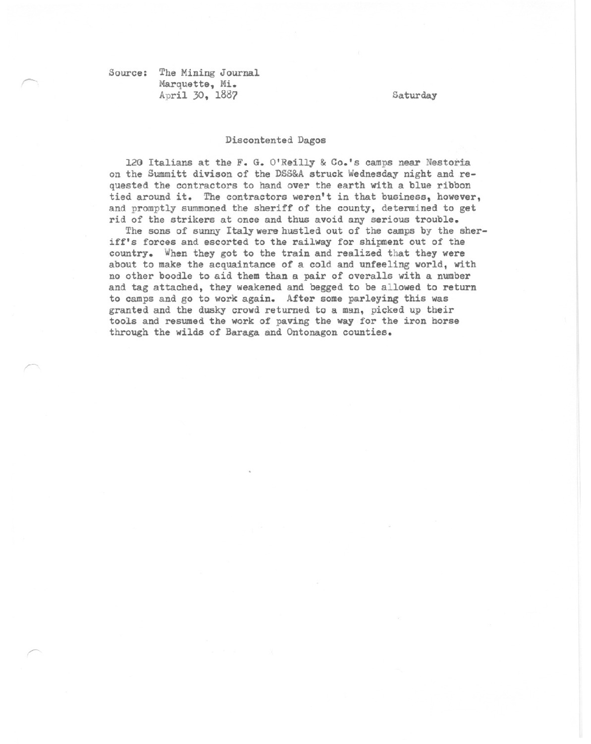 120 Italians at the F. G. O'Reilly & Co's camps near Nestoria on the Summitt division of the DSS&A struck Wednesday night and requested the contractors to hand over the earth with a blue ribbon tied around it. The contractors were'nt in that business, however,and promptly summoned the sheriff of the county, determined to get ride of the strikers at once and thus avoid any serious trouble. The sons of sunny Italy were hustled out of the camps by the sheriffs forces and escorted to the railway for shipment out of the country. When they got to the train and realized that they were about to make the acquaintance of a cold and unfeeling world, with no other doooble to aid them than a pair of overalls with a number and tag attached, they weakened and begged to be allowed to return to camps and go to work again.
