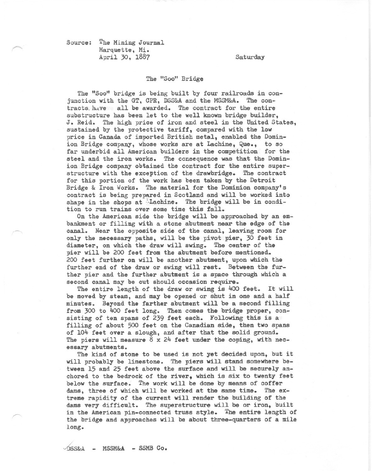 Soo bridge is being built by four railraods in conjuntion with the GT, CPR, DSS&A, and the MSSM&A. The contracts have all been awarded. The contract for the entire substructure has been let to the well known bridge builder, J. Reid. The high price of iron and steel in the United States sustained by the protective tariff, compared with the low price in Canada of improted British metal, enabled the Dominion Bridge Company, whose's workers are at Lachine, Que., to so far underbid all american builders in the competition for the steel and the iron works.