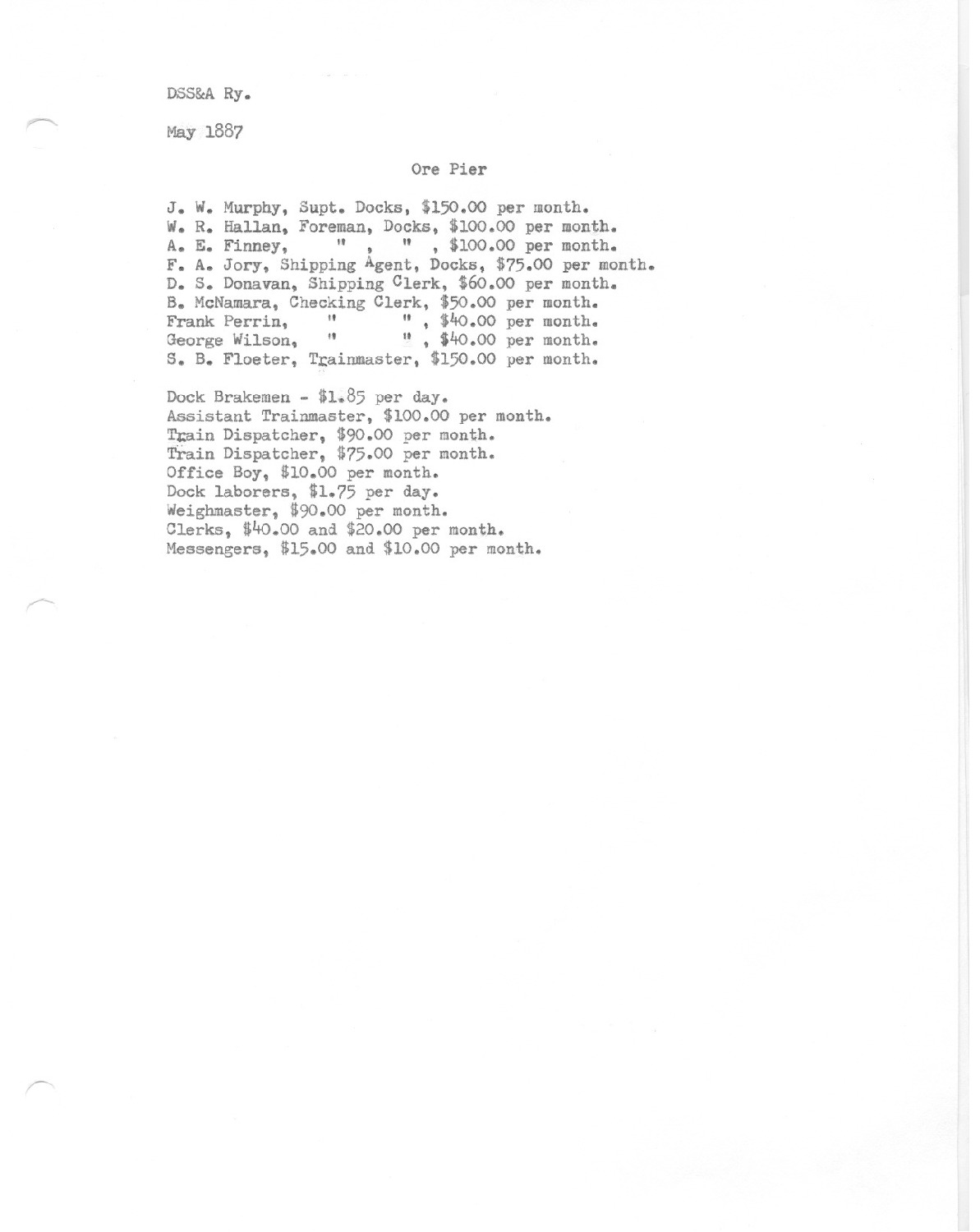 J. W. Murphy, Superintendent Docks, $150.00 per month. W. R. Hallan, Foreman Docks, $100.00 per month. A. E. Finney, Foreman, Docks, $1.00.00 per month. F. A. Jory, Shipping Agent, Docks, $75.00 Dollar pre month. D. S. Donavan, Shipping Clerk $60.00 per month. B. McNamara, Checking Clerk, $50.00 per month. Frank Perrin, Checking Clerk, $40.00 per month, George Wilson, Checking Clerk, $40.00 per month, S. B. Floeter, Trainmaster, $1250.00 per month.