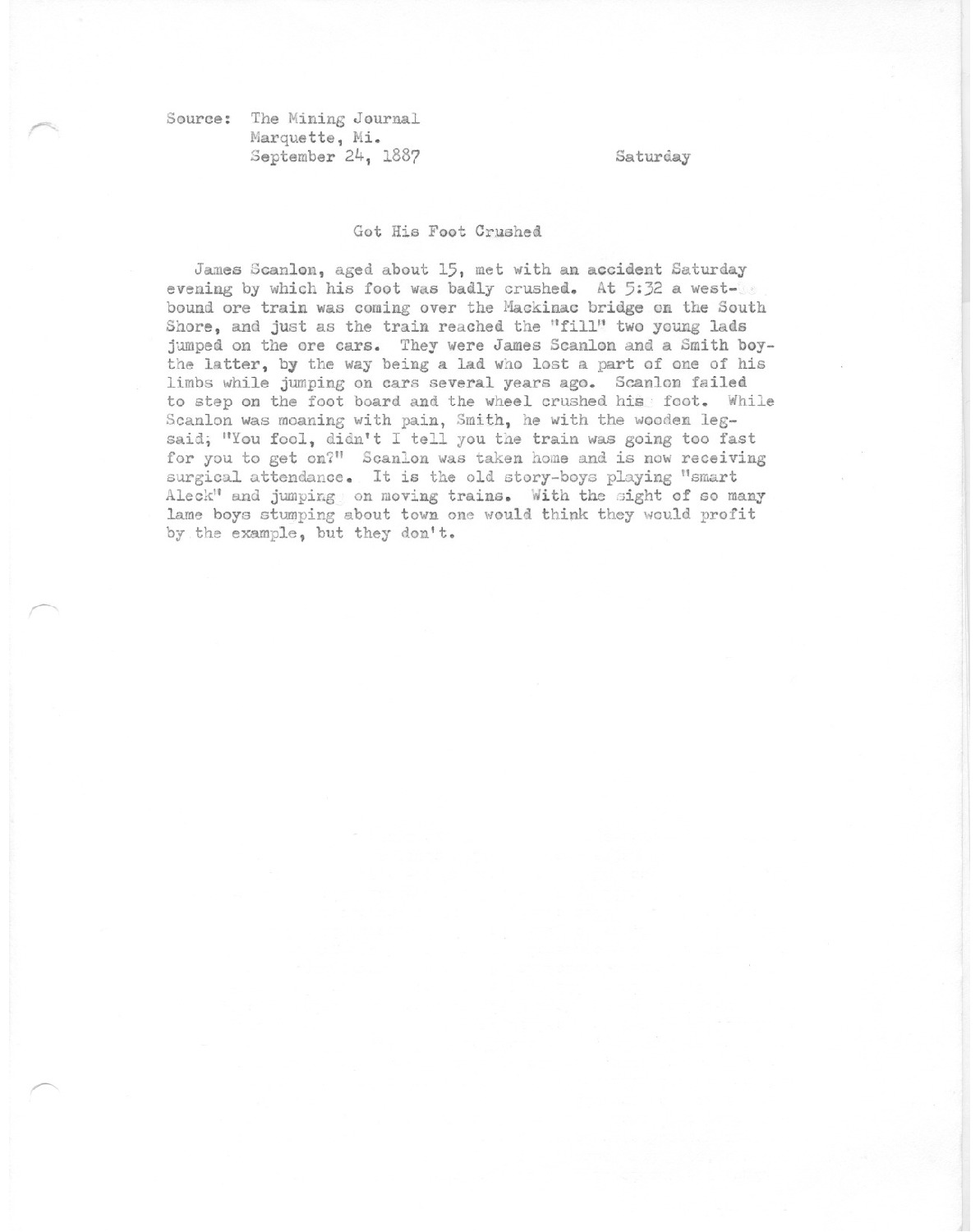 James Scanlon, aged about 15, met with an accident Saturday evening by which his foot was badly cushed. At 5:32 a westbound ore train was coming over the Mackinac bridge on the South Shore, and just as the train reached the fill two young lads jumped on the ore cars. They were James Scanlon and a Smith boy, the latter by the way being a lad who lost a part of one of his limbs while jumping on cars several years ago. Scalon failed to step on the foot board and the wheel crushed his foot.