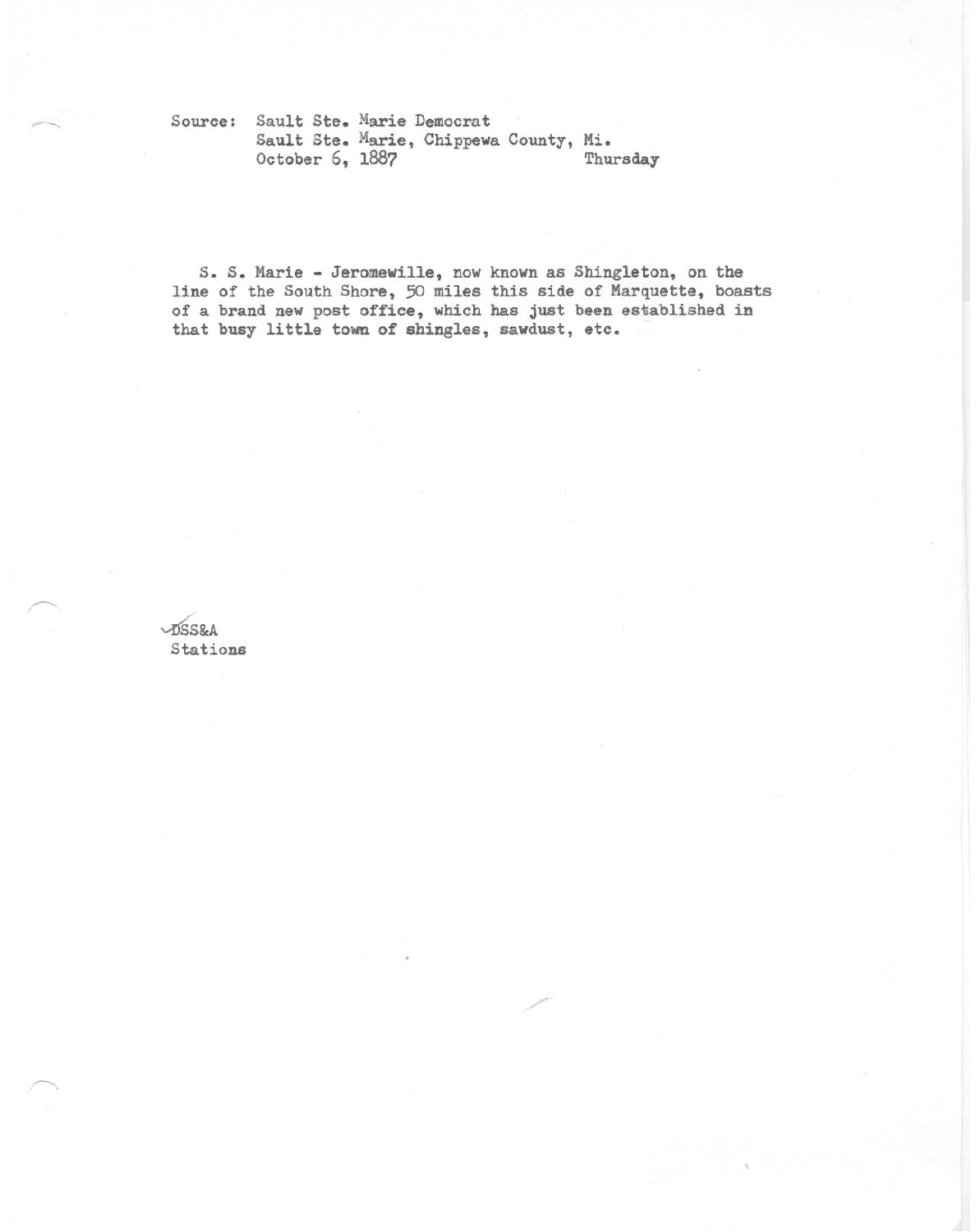 Jeromewille, now known as Shingleton, on the line of the South Shore, 50 miles this side of Marquette, boasts of a brand new post office, which has ben established in that busy little town of shingles, sawdust, etc.