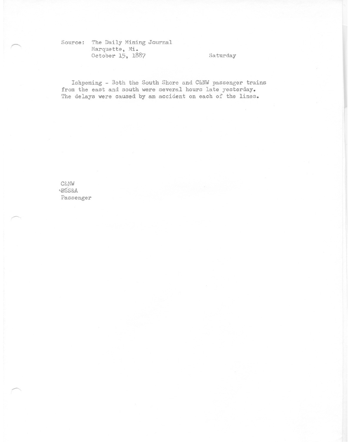 Both the South Shore and C&NW passenger trains from the east and south were several hours late yesterday. The delays were caused by an accident on each of the lines.