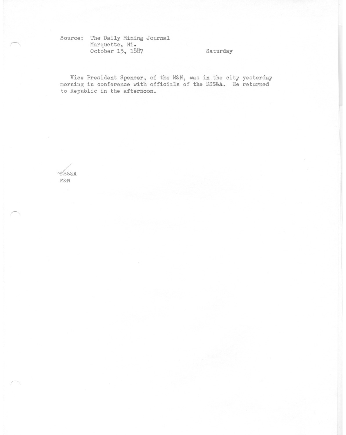 Vice Presidental Spencer, of the M&N, was in the city yesterday morning in conference with officals of the DSS&A. He returned to Republic in the afternoon.