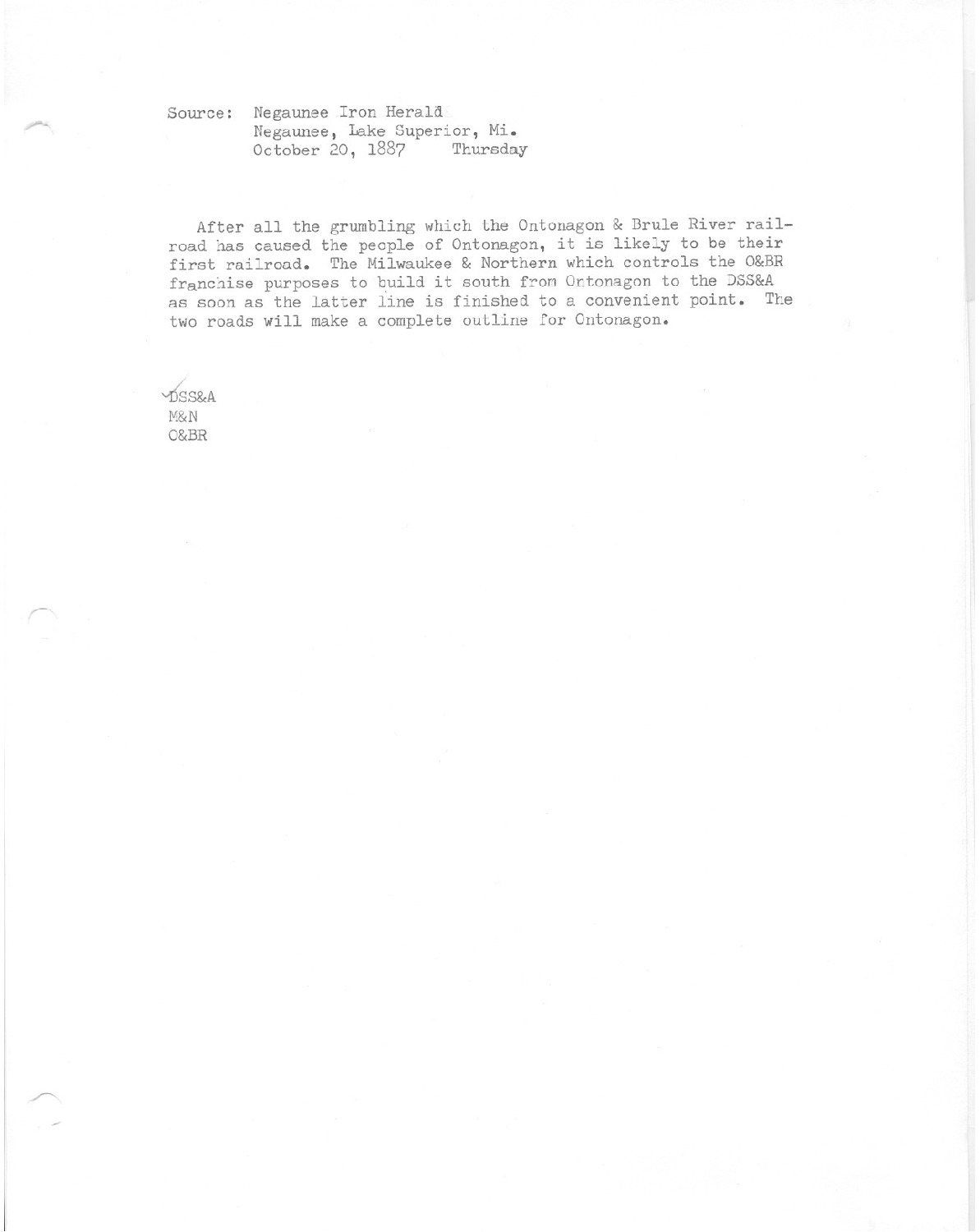 After all the grumbling which the Ontonagon & Brule River railroad has caused the people of Ontonagon, it is likely to be their first railroad. The Milwaukee & Northern which controls the O&BR franchie purposes to build it south from Ontonagon to the DSS&A as soon as the latter line is finished to a convenient point. The two roads will make a complete outline for Ontonagon.