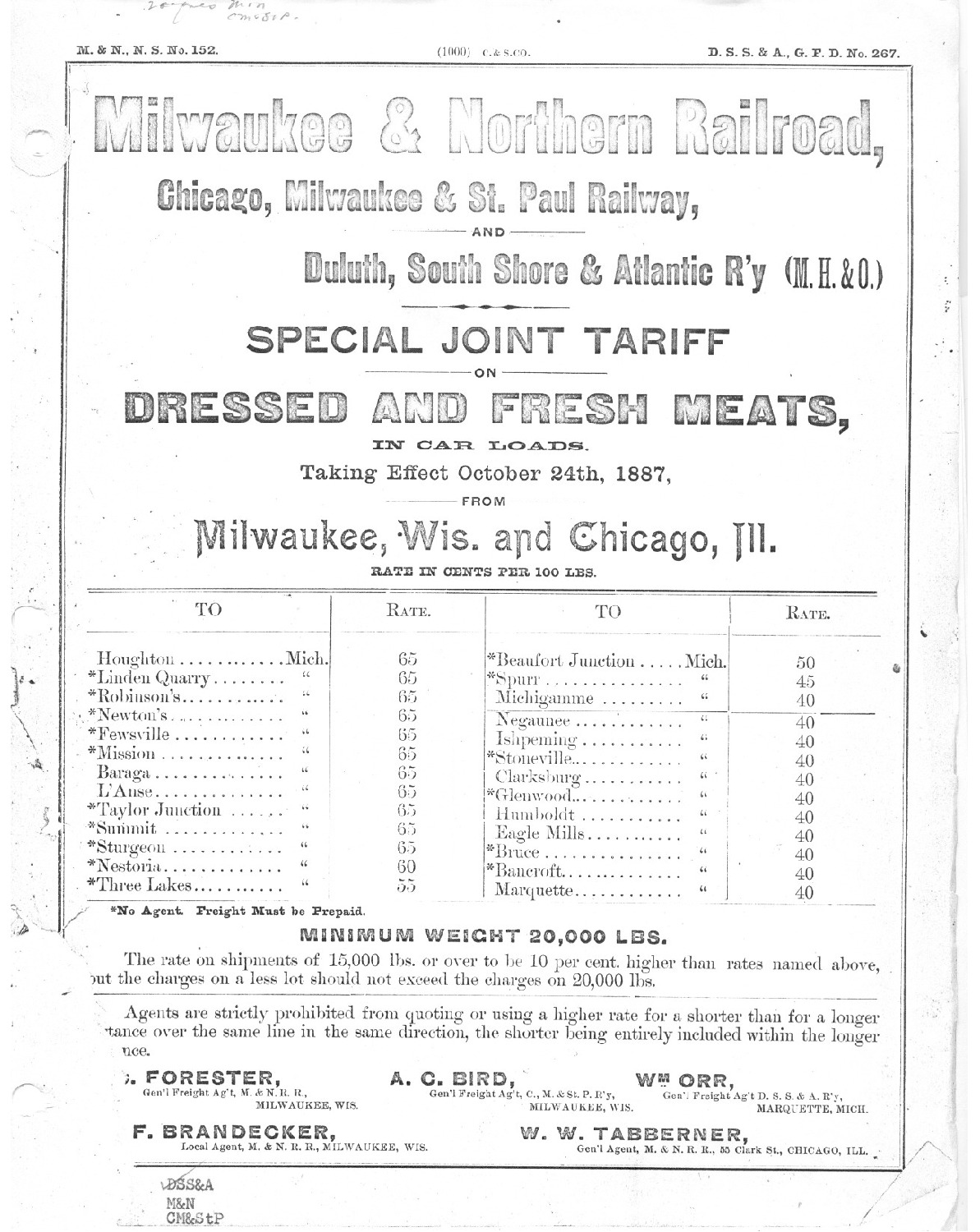 Milwauke & Northern Railroad, Chicago, Milwaukee & St. Paul Railway, Duluth South Shore & Atlantic Railway, Special Joint Tariff on Dressed and Fresh Meats, in car loads take effect October 24, 1887 from Milwaukee Wisconsin and Chicago Illinois. Rate in cents per 100 LBS.