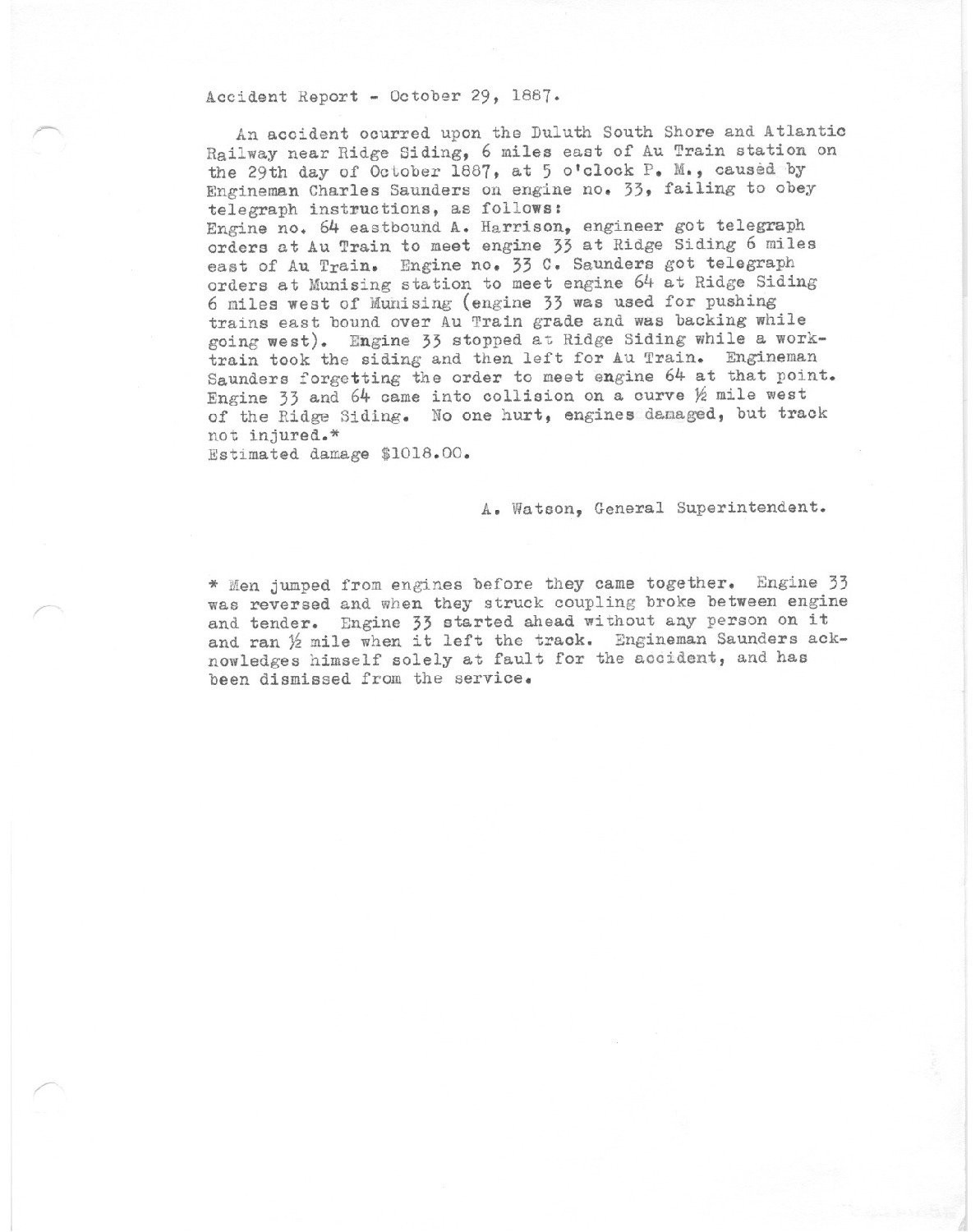 An accident occurred upon the Duluth, South Shore, and Atlantic Railway near Ridge Siding, 6 miles east of Au Train station on the 29th day of October 1887, at 5 o'clock P.M. caused by Engineman Charles Saunders on engine number 33, failing to obey telegraph instructions. Estimated damage $1,018.00. Men jumped from engines before they came together. Engine 33 was reversed and when the struck coupling broke between engine and tender. Engine 33 started ahead without any person on it and ran 1/2 mile when it left the track. Engineman Saunders acknowledges himself soley at fault for the accident and has been dismissed from the service.