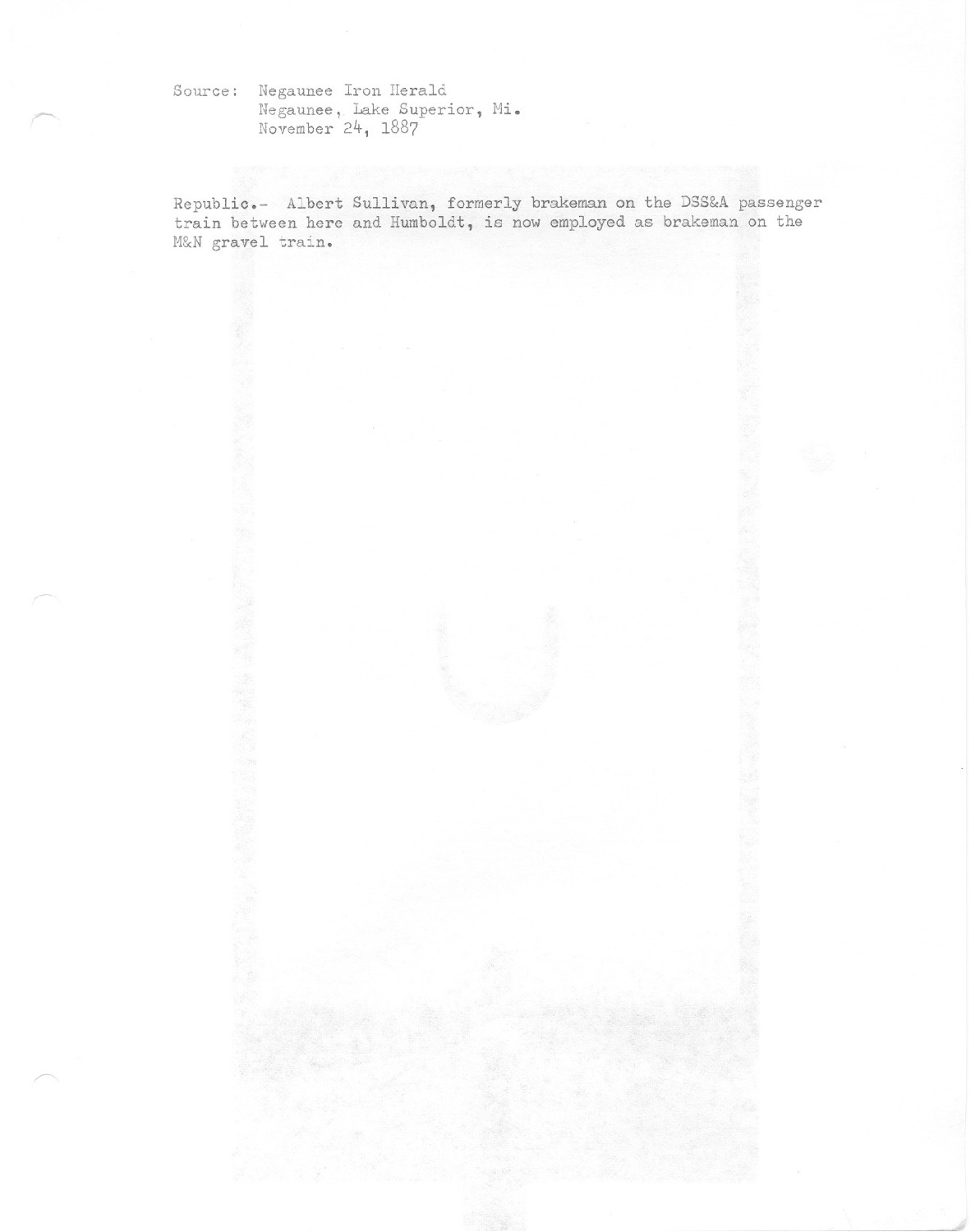 Republic - Albert Sullivan, formerly brakeman on the DSS&A passenger train between here and Humboldt, is now employed as brakeman on the M&N gravel train.