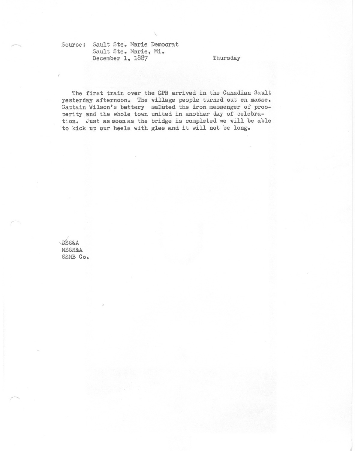 The first train over the CPR arrived in the Canadian Sault yesterday afternoon. The village people turned out in mass. Captain Wilson's battery saluted the iron messenger of prosperity and the whole town united in another day of celebration. Just as soon as the bridge is completed we will be able to kick up our heels with glee and it will not be long.