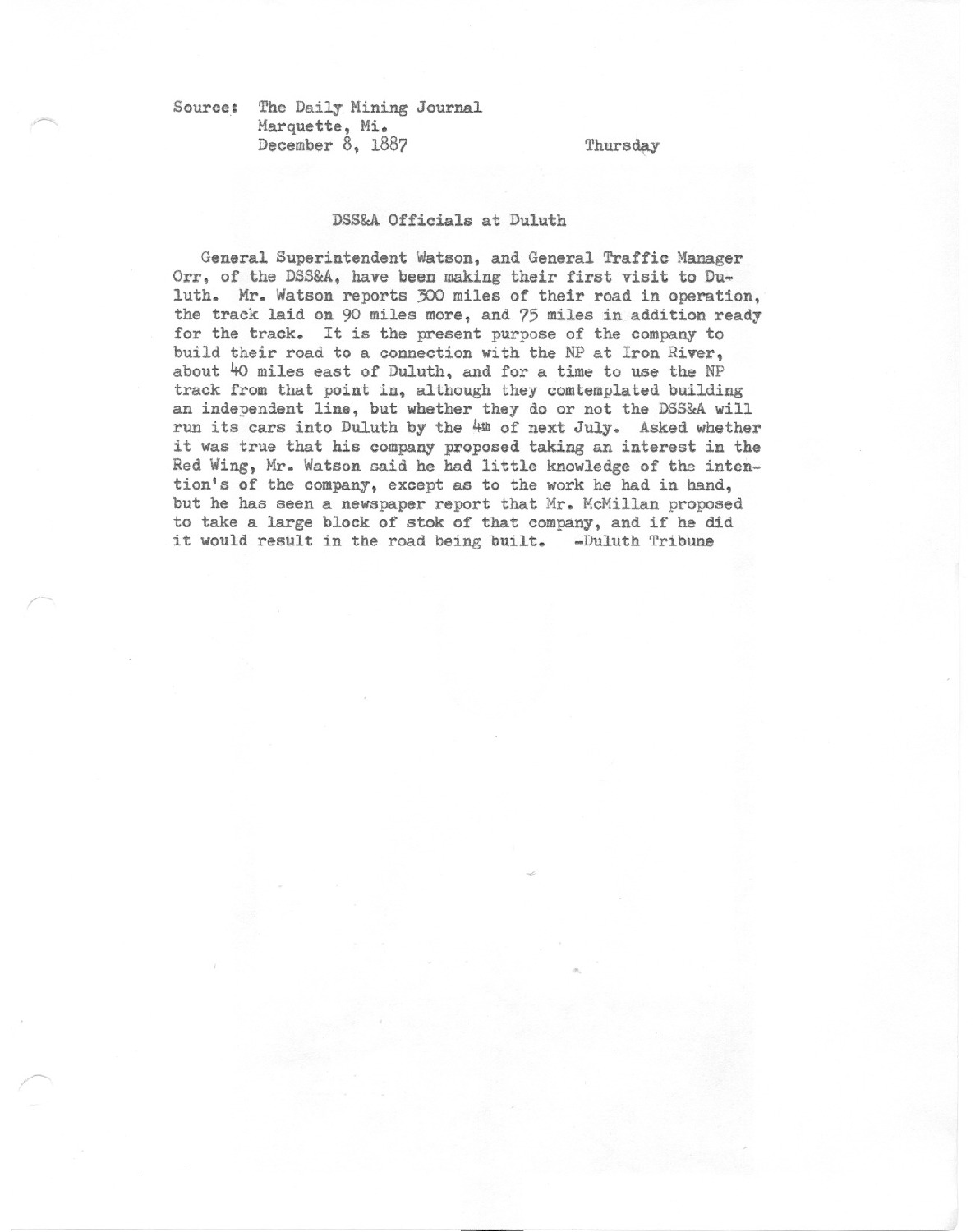 General Superintendent Watson, and General Traffic Manager Orr, of the DSS&A have been making their first visit to Duluth. Mr. Watson reports 300 miles of their road in operation, the track laid on 90 miles more, and 75 miles in addition ready for the track.