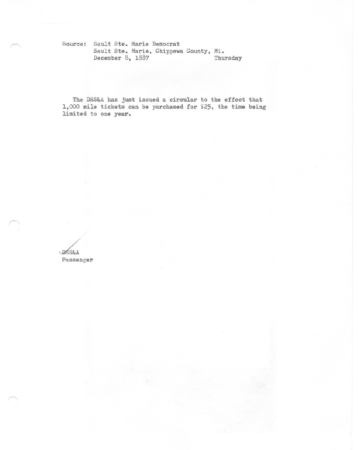The DSS&A has just issued a circular to the affect that 1,000 mile tickets can be purchased for $25, the time being limited to one year.