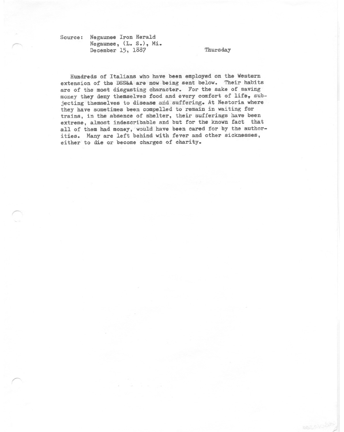 Hundreds of Italians who have been employed on the Western extension of the DSS&A are now being sent below. Their habits are of the most disgusting character. For the sake of saving money they deny themselves food and devery comfort of life.
