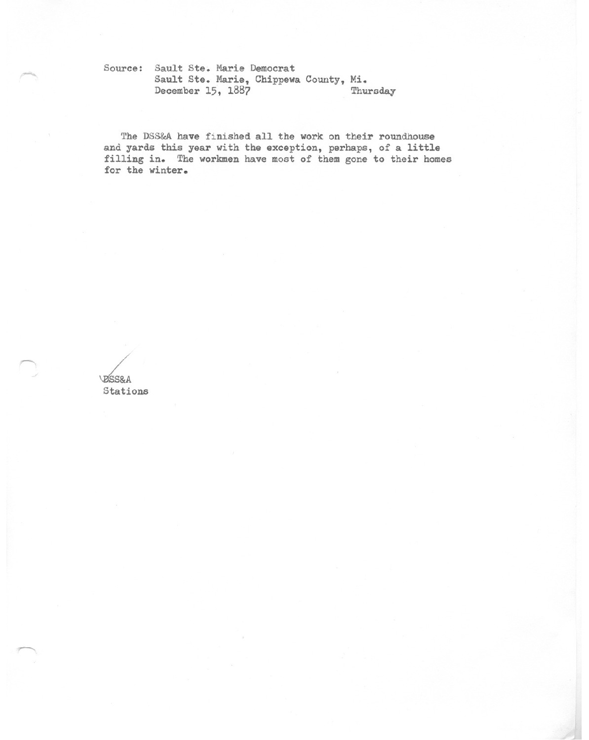 The DSS&A have finished all the work on their roundhouse and yards this year with the exception, perhaps, of a little filling in. The workmen have most of them gone to their homes for the winter.