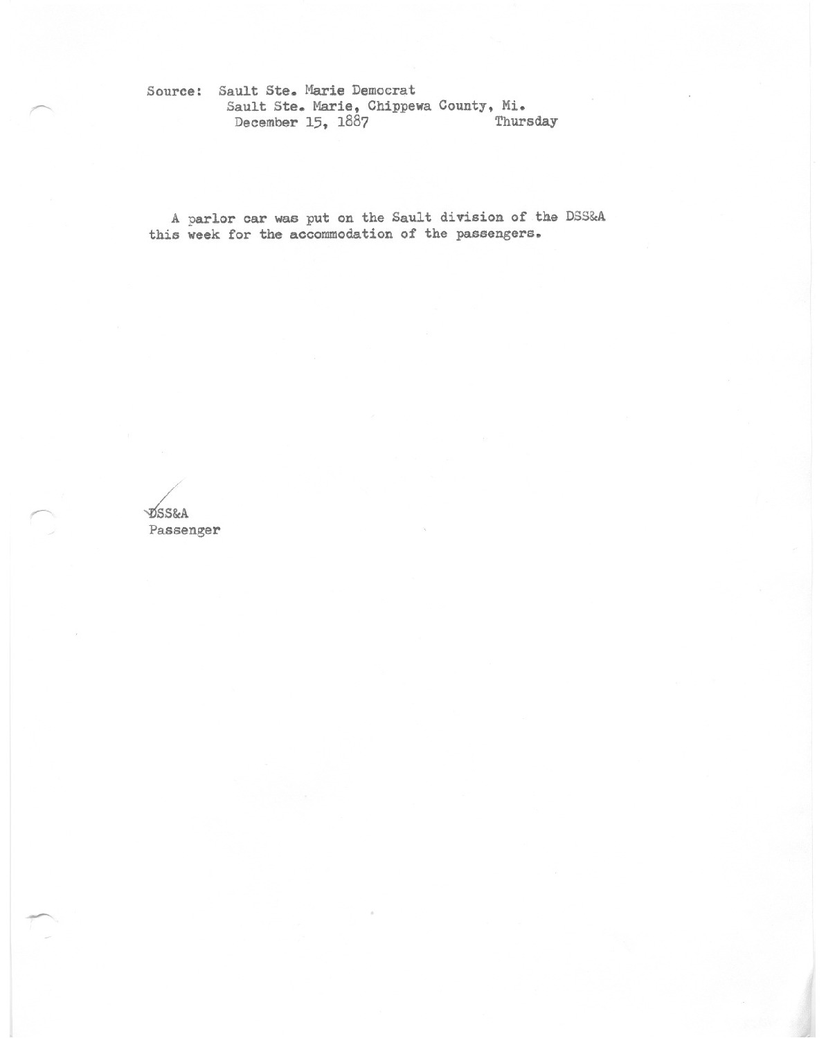 A parlor car was put on the Sault divison of the DSS&A this week for the accomodation of the passengers.