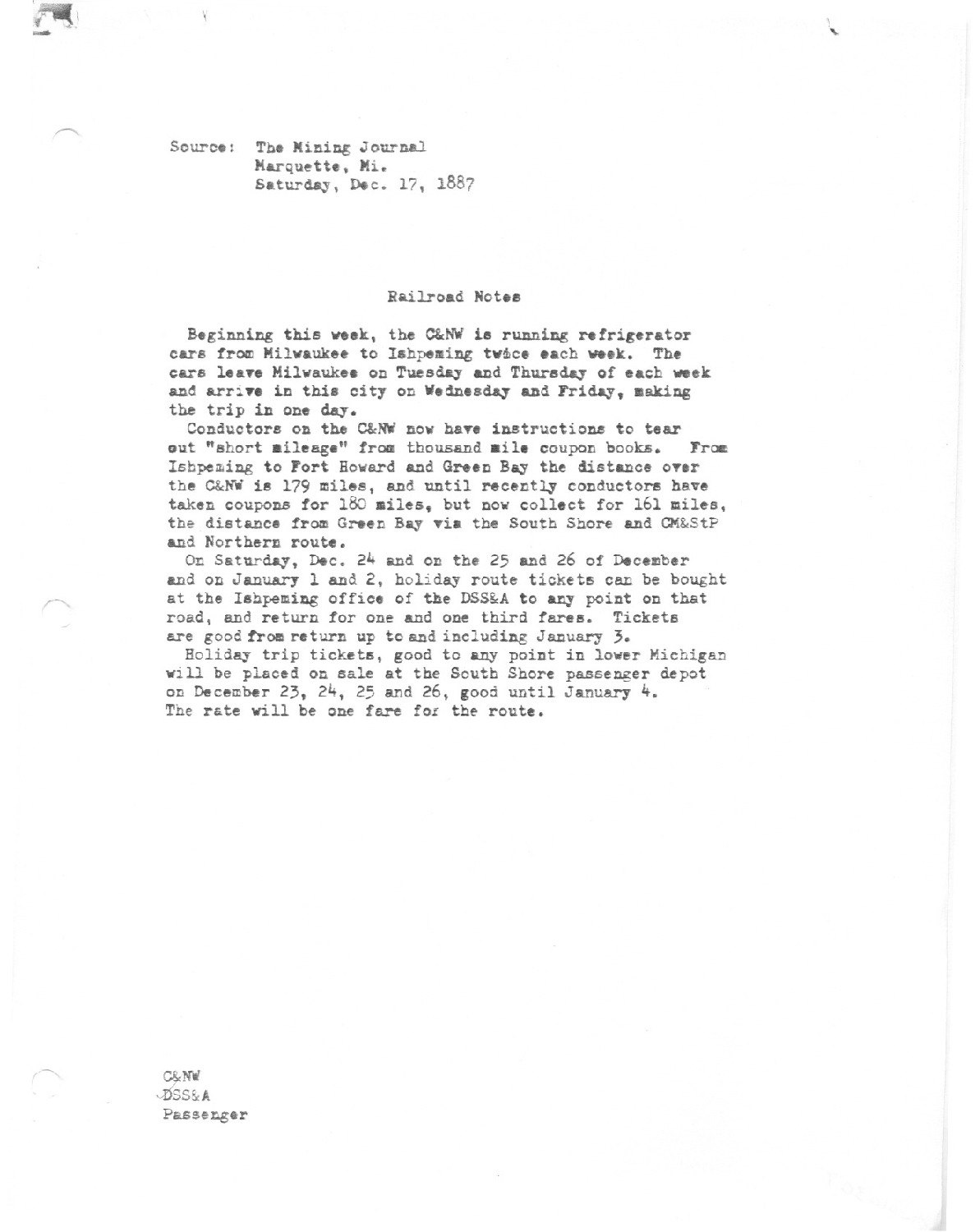 Beginning this week, the C&NW is running refrigerator cars fron Milwaukee to Ishpeming twice each week. The cars leave Milwaukee on Tuesday and Thursday of each week and arrive in this city on Wednesday and Friday, making the trip in one day.