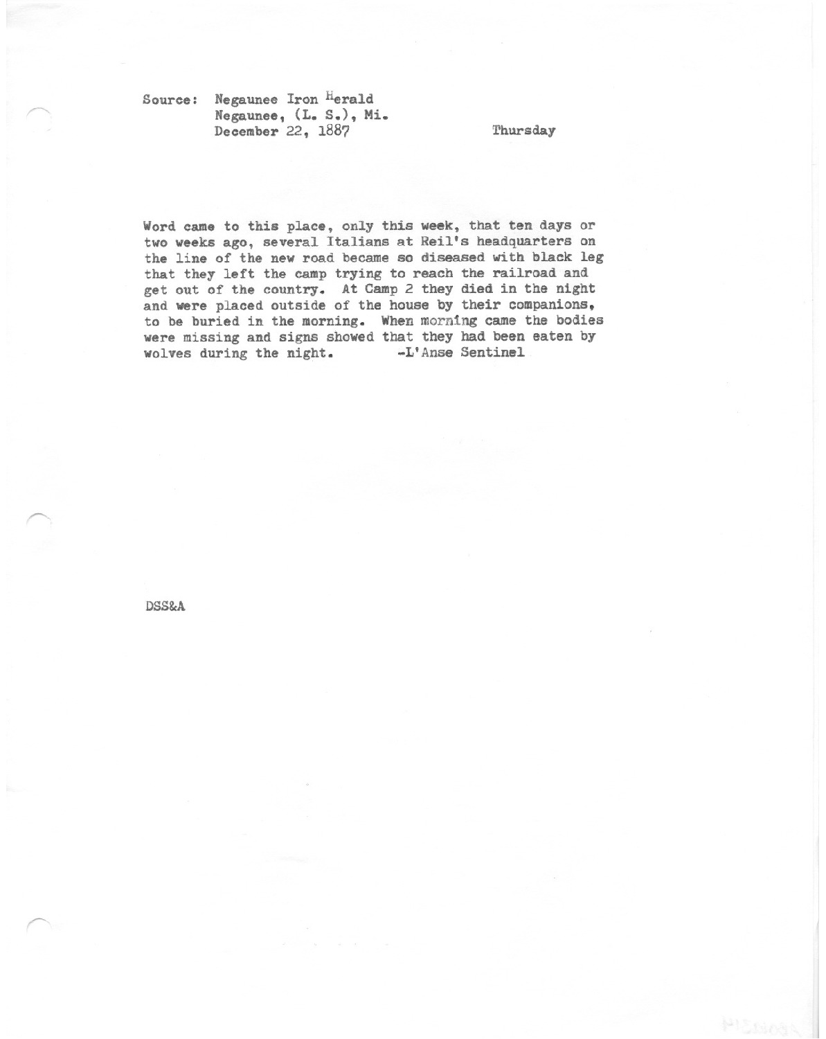 Word came to this place, only this week, that ten days or two weeks ago, several Italians at Reil's headquarters on the line of the new road became so diseased with black leg that they left the camp trying to reach the railroad and get out of the country. At Camp 2 they died in the night and were placed outside of the house by their companions, to be buried in the morning. When morning came the bodies wre missing and signs showed that they had been eaten by wolves durning the night.