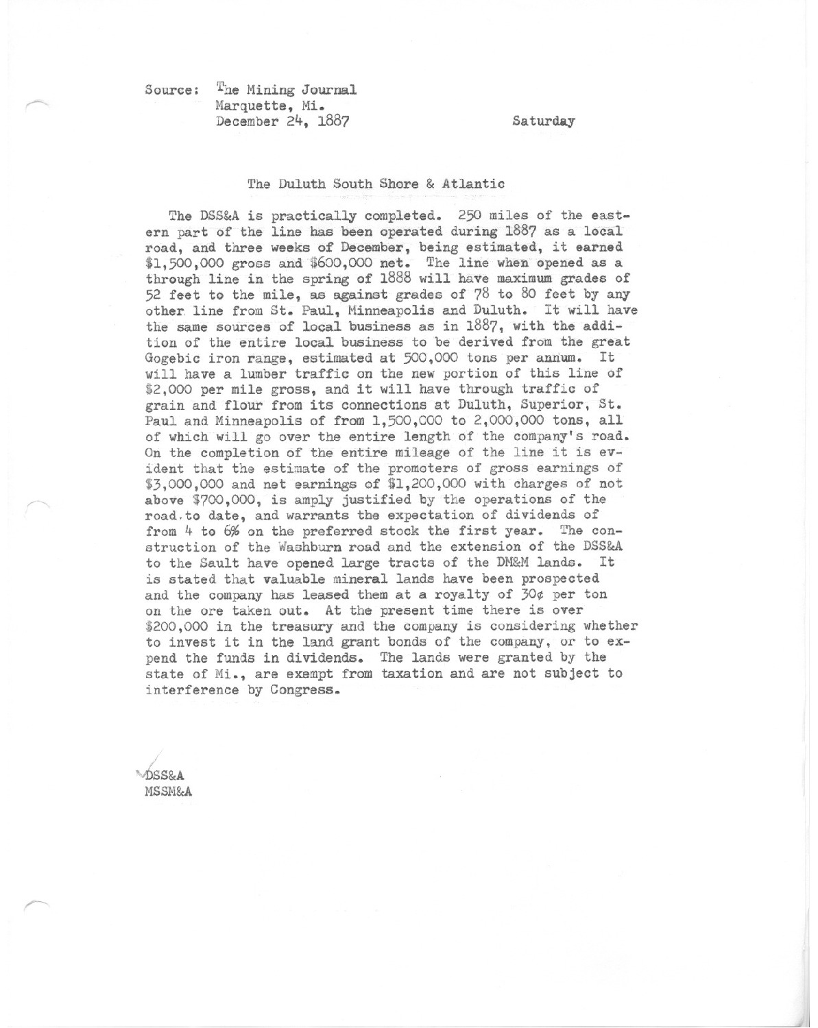 The DSS&A is practically completed. 250 miles of the eastern part of the line has been operating durning 1887 as a local road, and 3 weeks of December, being estimated, it earned $1,500,000 gross and 600,000 net. The line when opended as a through line in the spring of 1888 will have maxiimum grades of 52 feet to the mile.