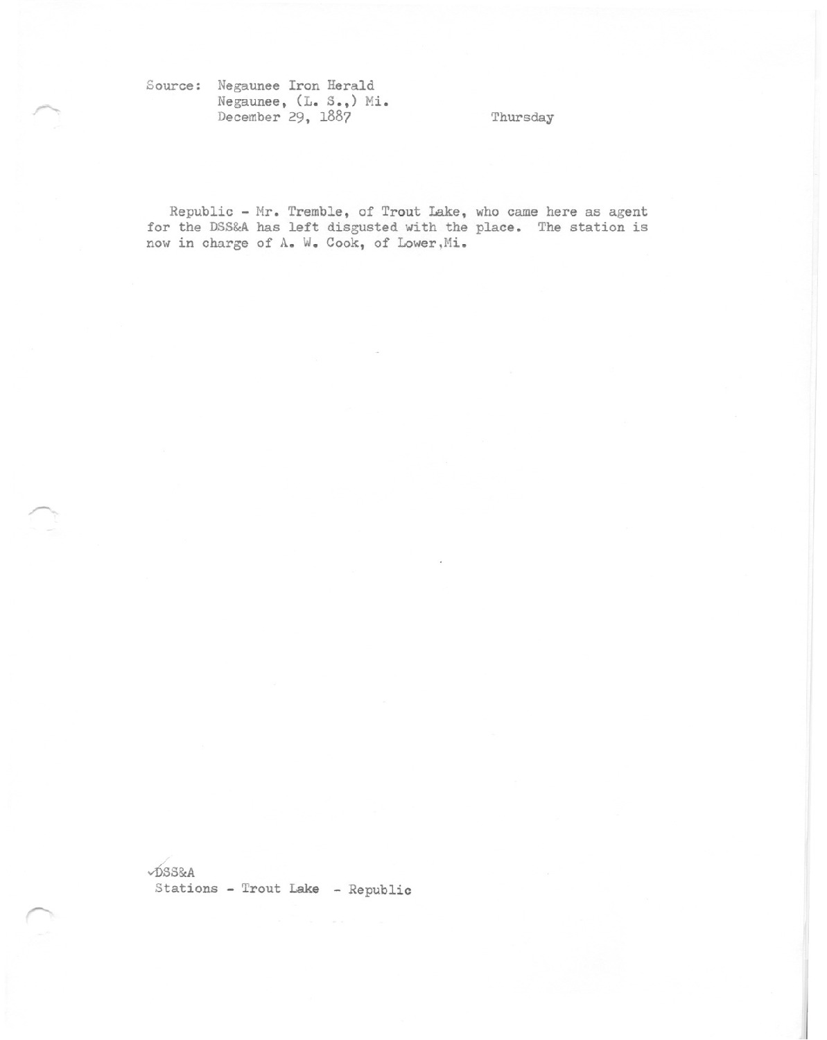 Republic - Mr. Tremble of Trout Lake, who came here as agent for the DSS&A has left disgusted with the place. The station is now in charge of A.W. Cook, of lower Michigan.