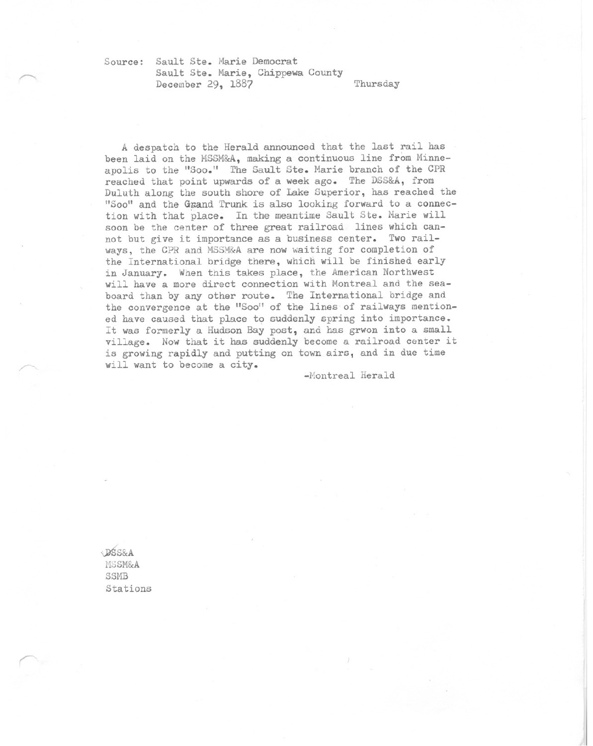A despatch to the Herald anounced that the last rail has been laid on the MSSM&A, making a continuous line from Minnapolis to the Soo. The Sault Ste Marie branch of the CPR reached that point upwards of a week ago. The DSS&A, from Duluth along the south shore of Lake Superior, has reached the ""Soo"" and the Grand Trunk is also looking forward to a connection with the place.""