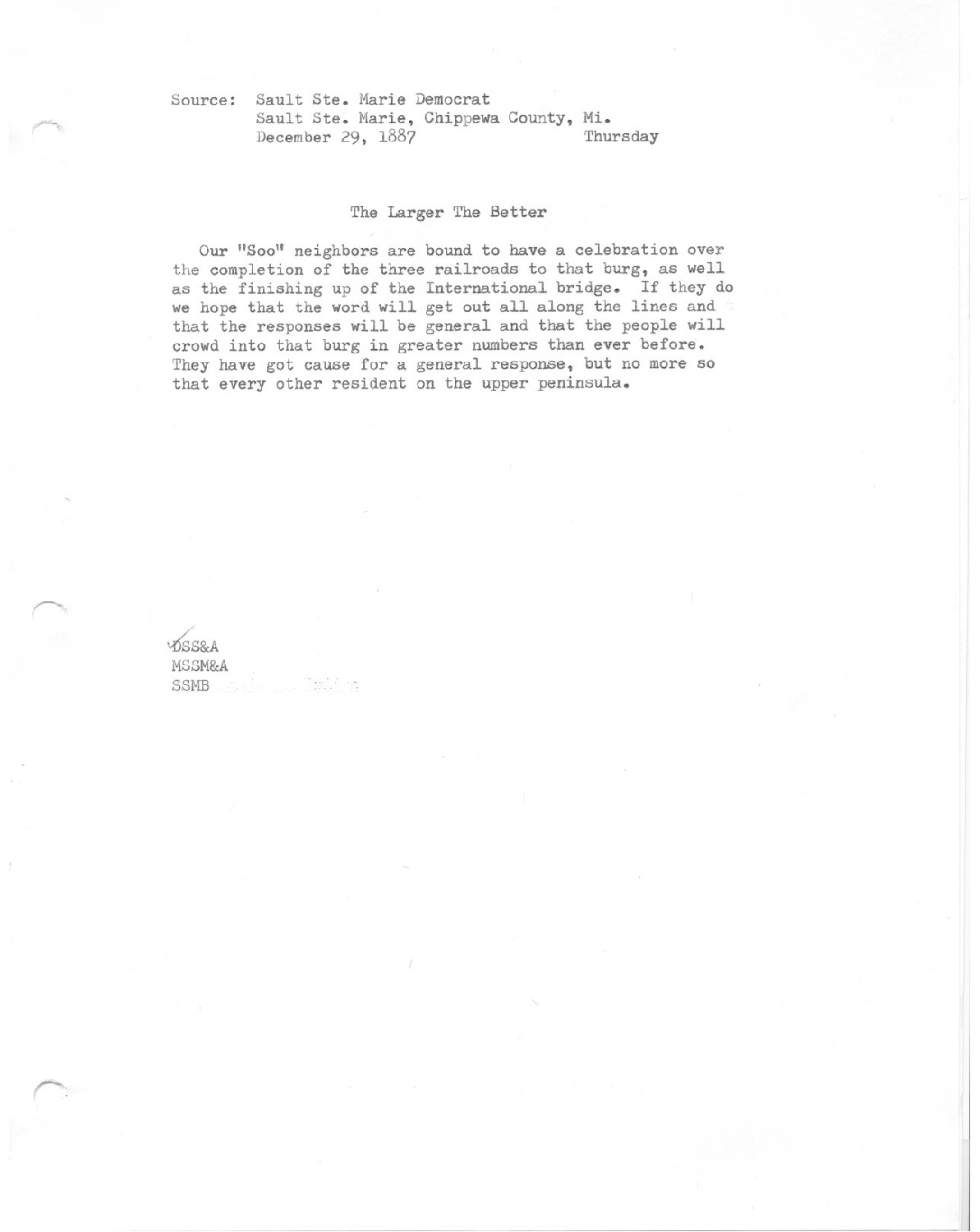 Our Sault Ste Marie neighbors are bound to have a celebration over the completion of the three railroads to that burg, as well as the finishing up of the International bridge.
