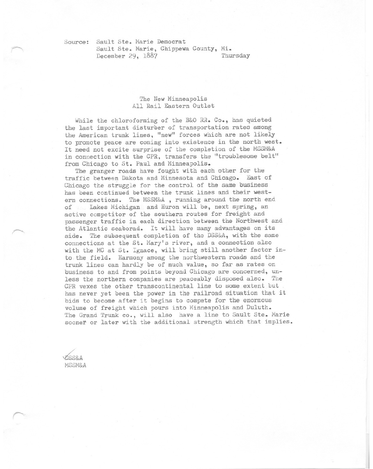 While the chloroforming of the B&O RR. Co., has quieted the last important disturber of transportation rates among the American trunk lines, new forces which are not likely to promote peace are coming into existence in the north west. It need not excite suprise of the completion of the MSSM&A in connection with the CPR, transfers the ""troublesome belt"" from Chicago to St. Paul and Minneapolis.""