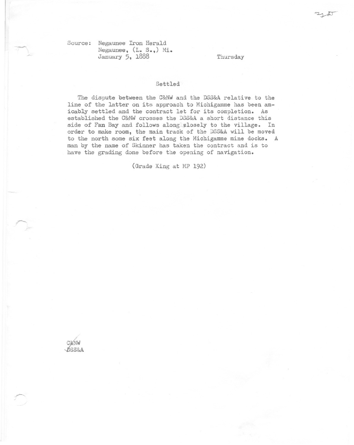 The dispute between the C&NW and the DSS&A relative to the line of the latter on its approach to Michigamme has been amicably settled and the contract let for its completion. As established the C&NW corsses the DSS&A a short distance this side of Fan Bay and follows along closely to the village. In order to make room, the main track of the DSS&A will be moved to the north some six feet along the Michigamme mine docks. A man of the name of Skinner has taken the contract and is to have the grading done before the opening of navigation.
