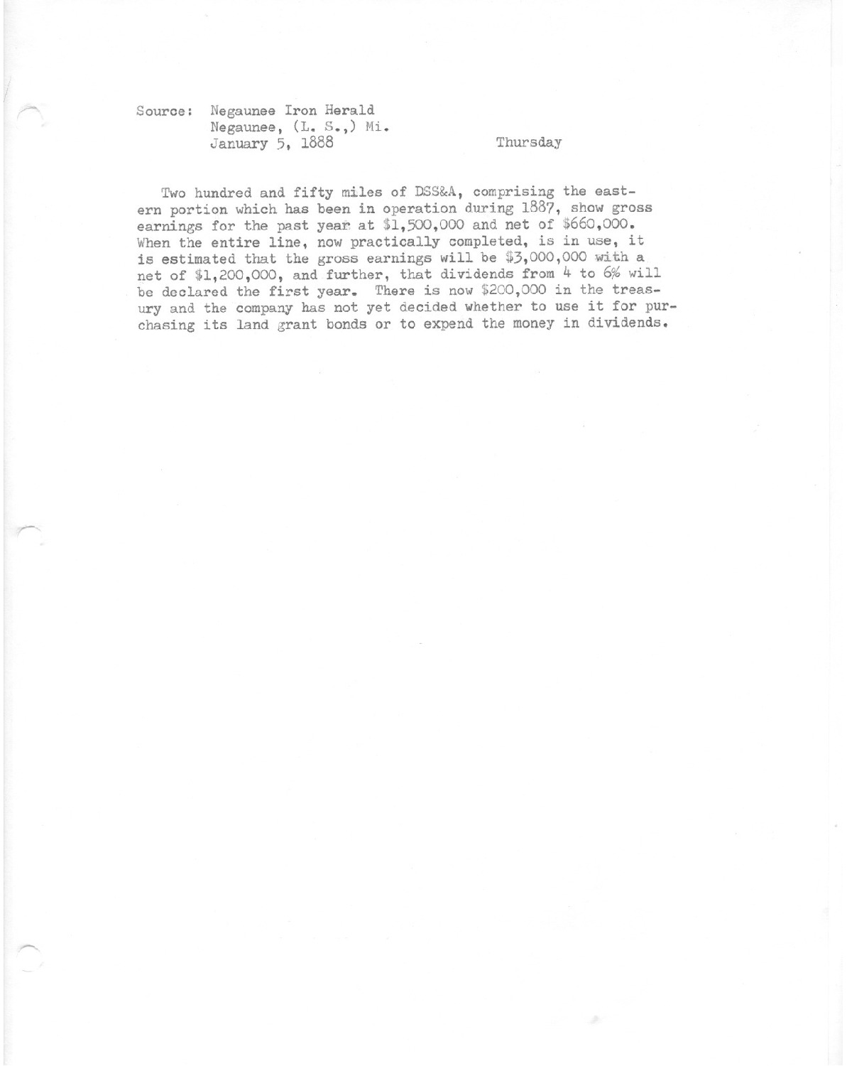 Two hundred and fifty miles of DSS&A, comprising the eastern portion which has been in operation durning the 1887, show gross earnings for the past year at 1,500,000 and net of $660,000. When the entire line, now practically completed, is in use, it is estimated that the gross earnings will be $3,000,000 with a net of $1,2000,000