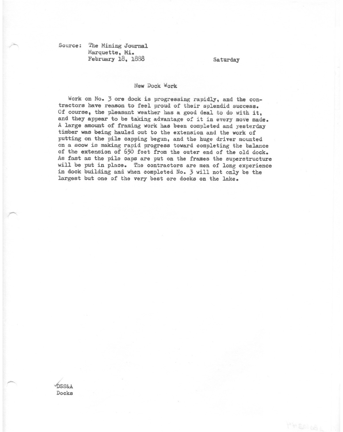 Work on Number 3 ore dock is progressing rapidly, and the contractors have reason to feel proud of their splendid success. Of course, the pleasant wewather has a good deal to do with it, and they appear to be taking advantage of it in every move made. A large amount of framing work has been completed and yesterday timber was being hauled out to the extension and the owrk of putting on the pile capping begun, and the huge driver mounted on a scow is making rapid progress, towards completing the balance of the extension of 650 feet fr om the outer end of the old dock.
