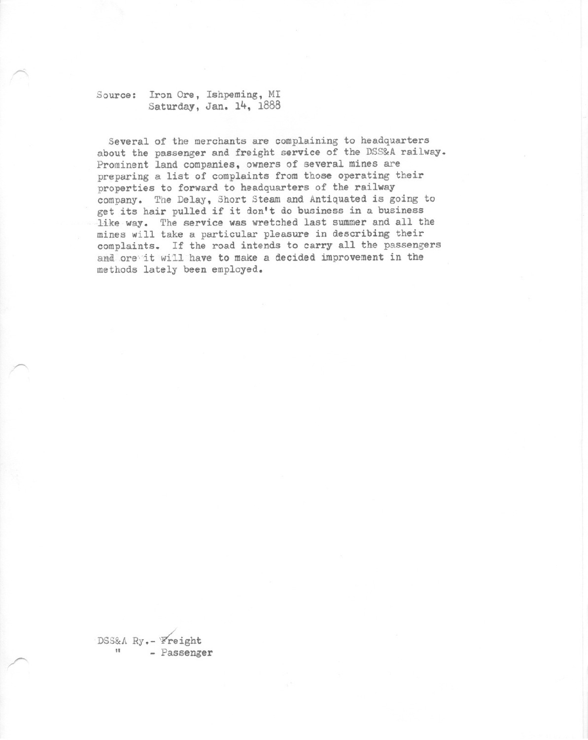 Several of the merchants are complaining to headquarters about the passenger and freight service of the DSS&A railway. Prominent land companies, owners of several mines are preparing a list of complaints from those operating their proerties to forward to headquarters of the railway company. The Delay, Short Steam and Antiquated is going to get its hair pulled if it don't do business in a business like way.